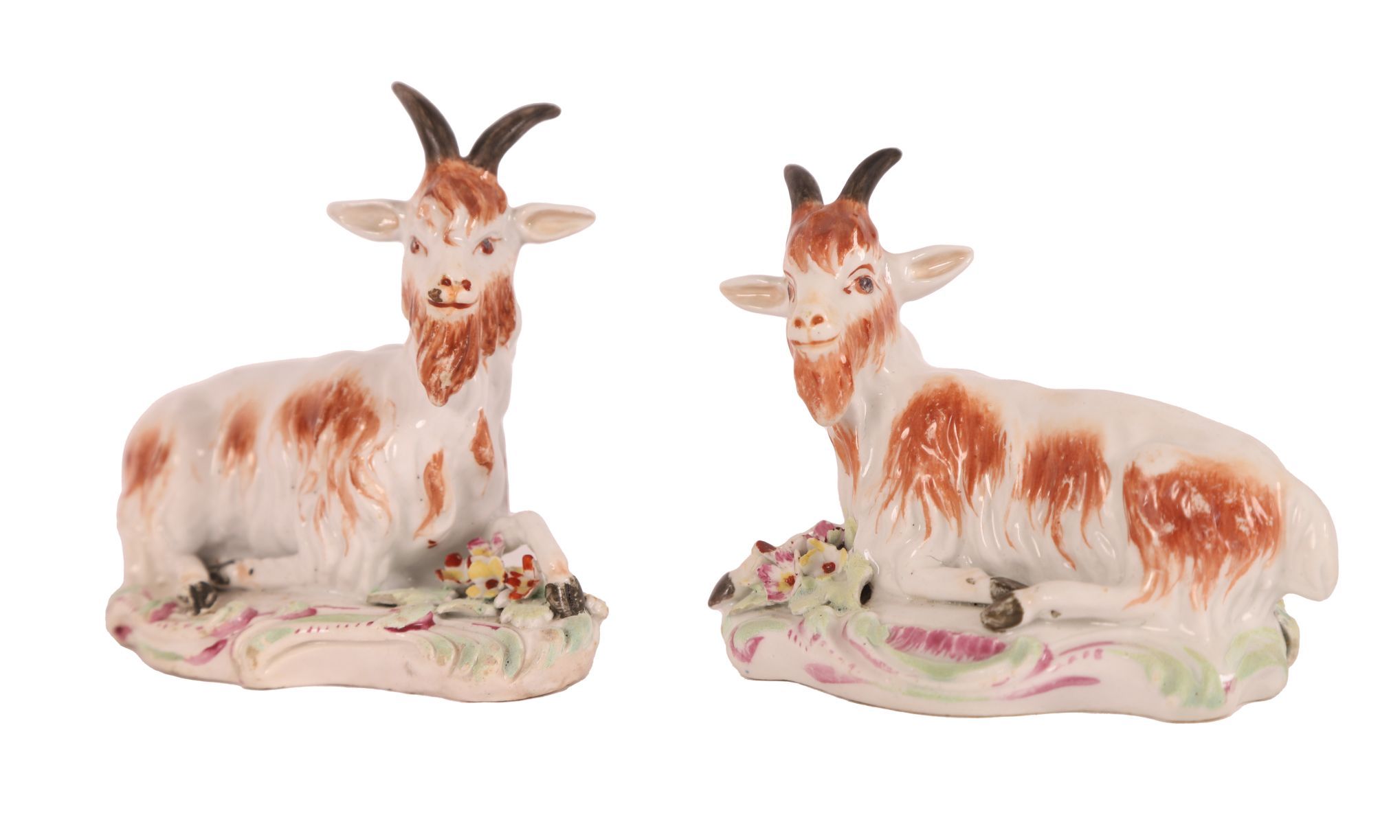 A pair of Derby porcelain models of recumbent goats, each finely modelled with naturalistic features and decorated in brown and cream enamels, raised on shaped bases with applied floral decoration.