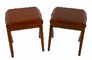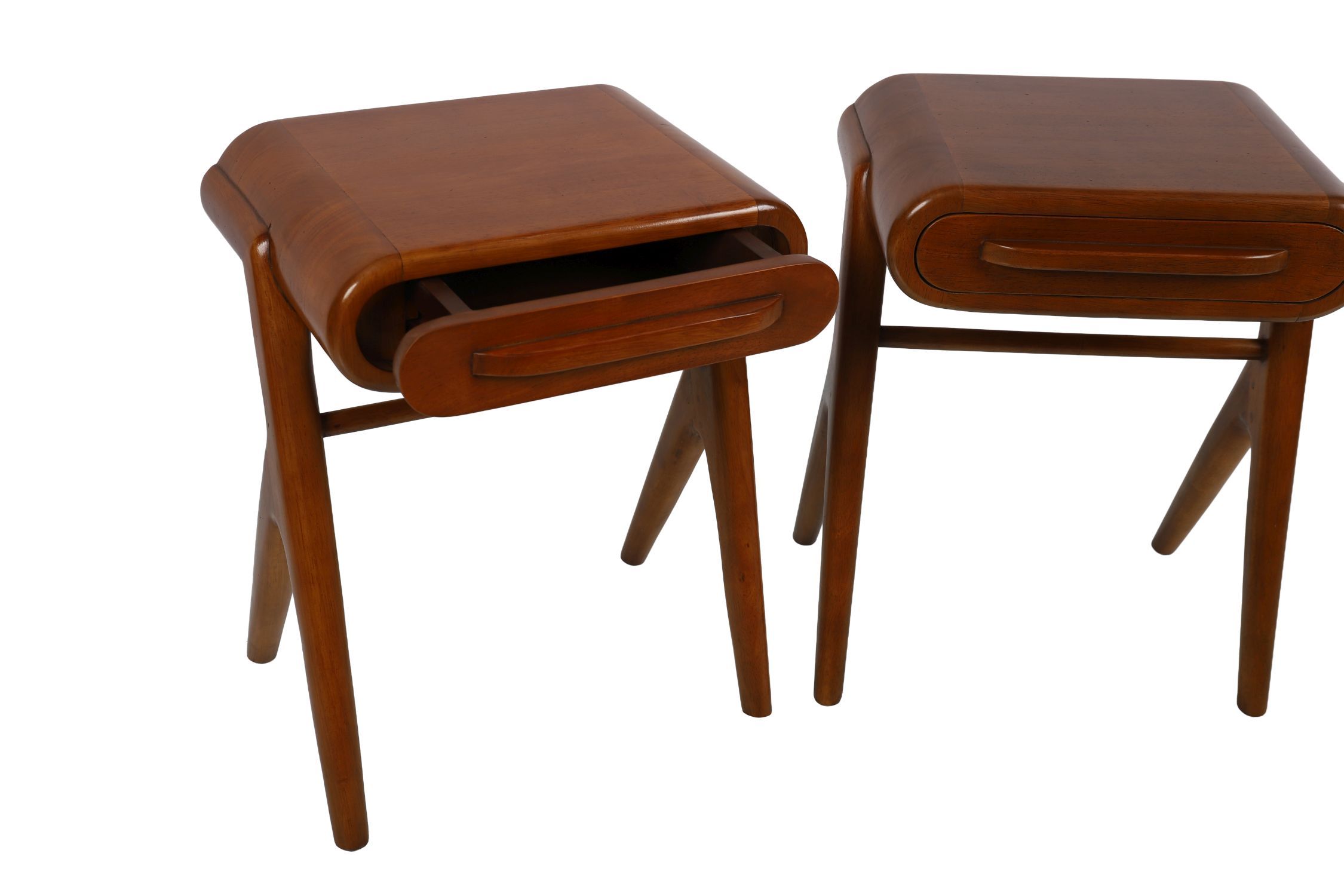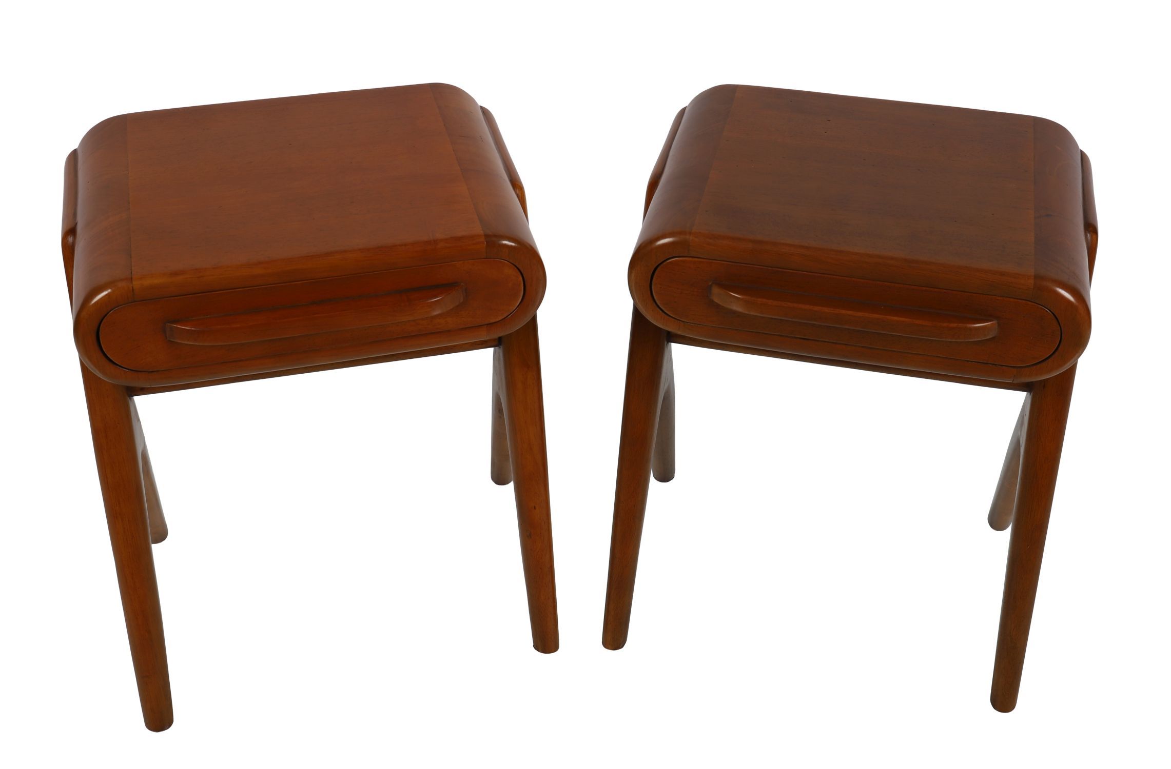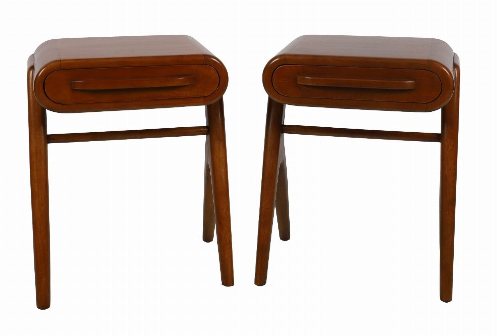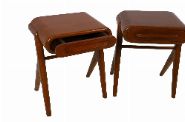 A pair of contemporary wooden tables with angular splayed supports and single drawer to each front.