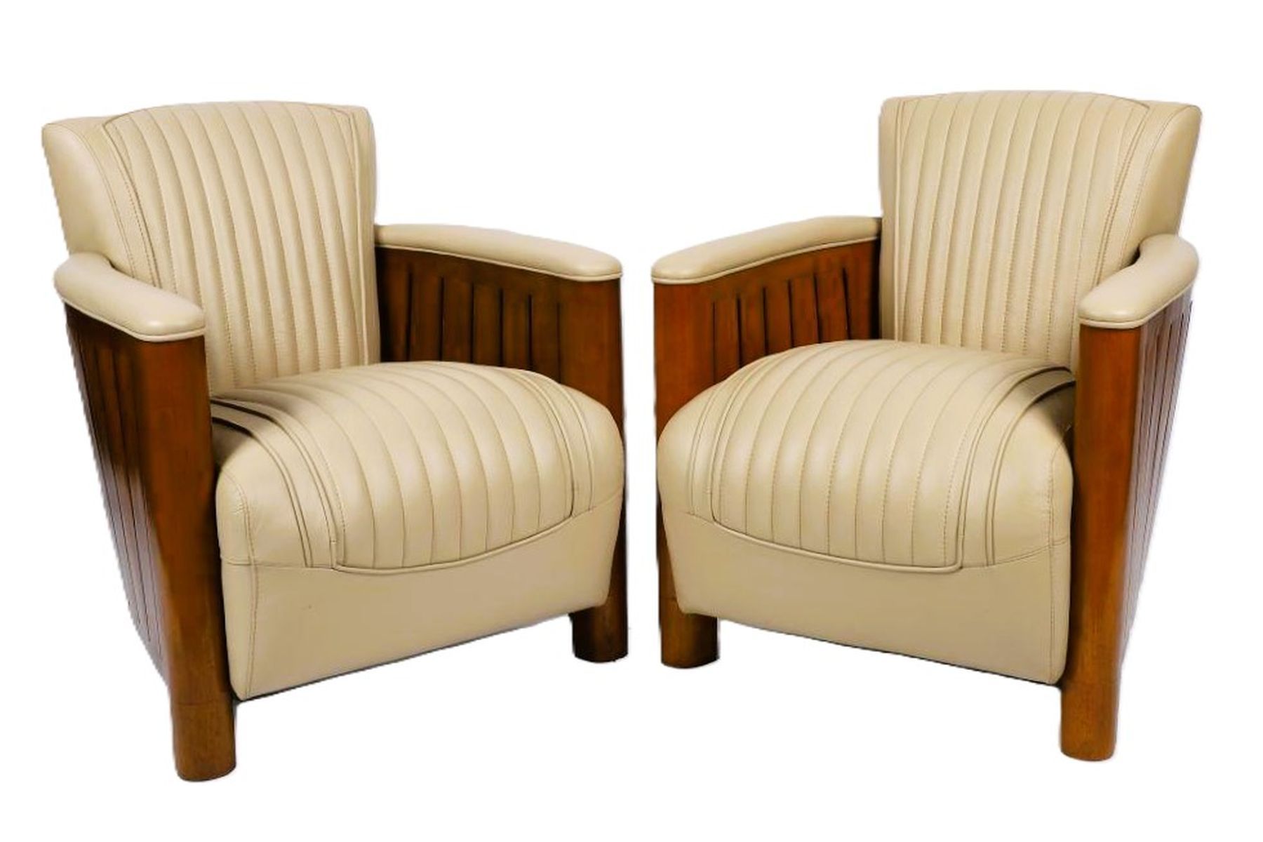 A striking pair of modern designer club armchairs, each with ribbed tan hide upholstery and curved fruitwood sides.