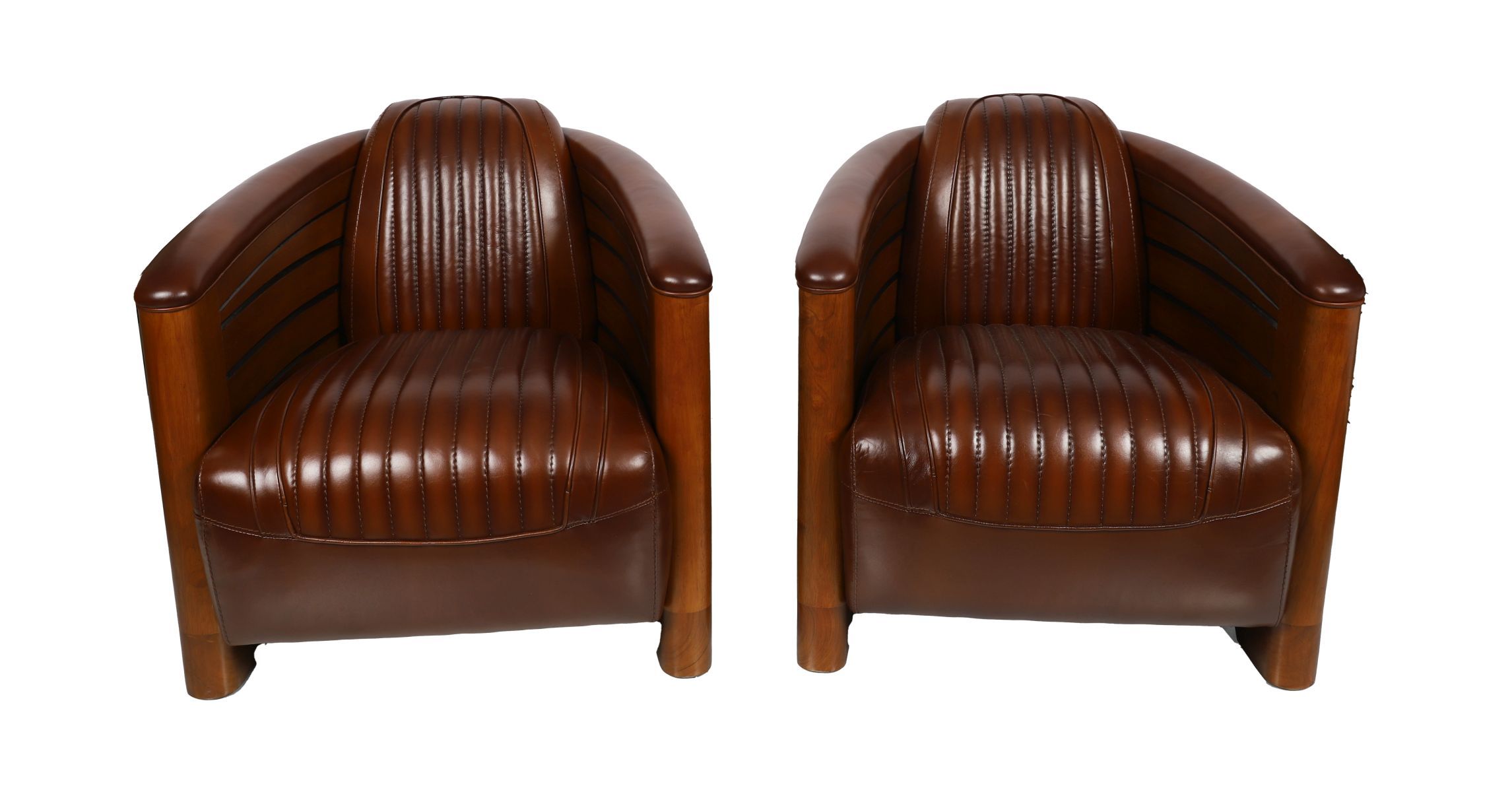Lot 407 PAIR OF DESIGNER HIDE-UPHOLSTERED AND FRUITWOOD CLUB ARMCHAIRS