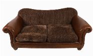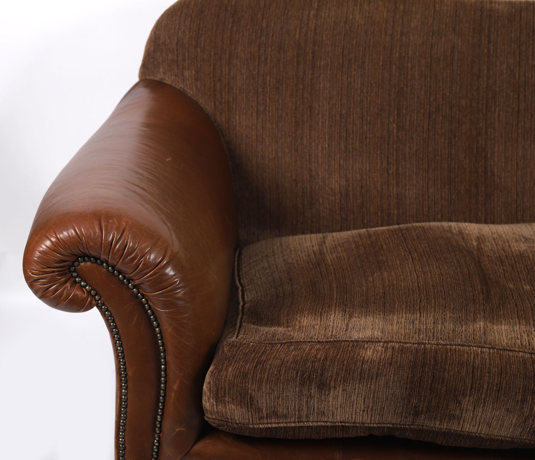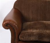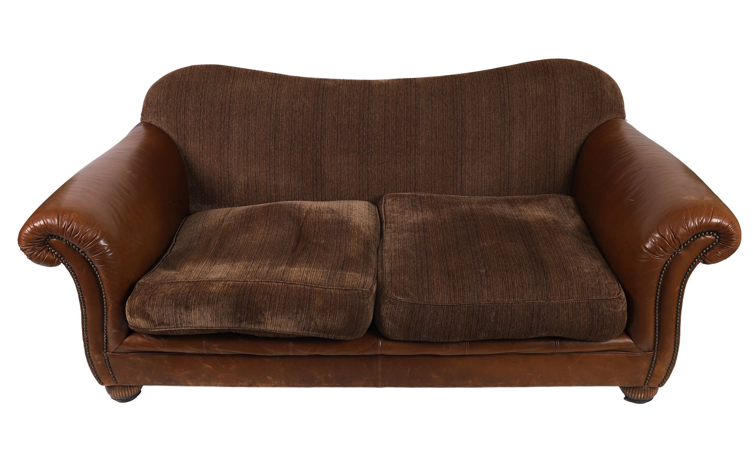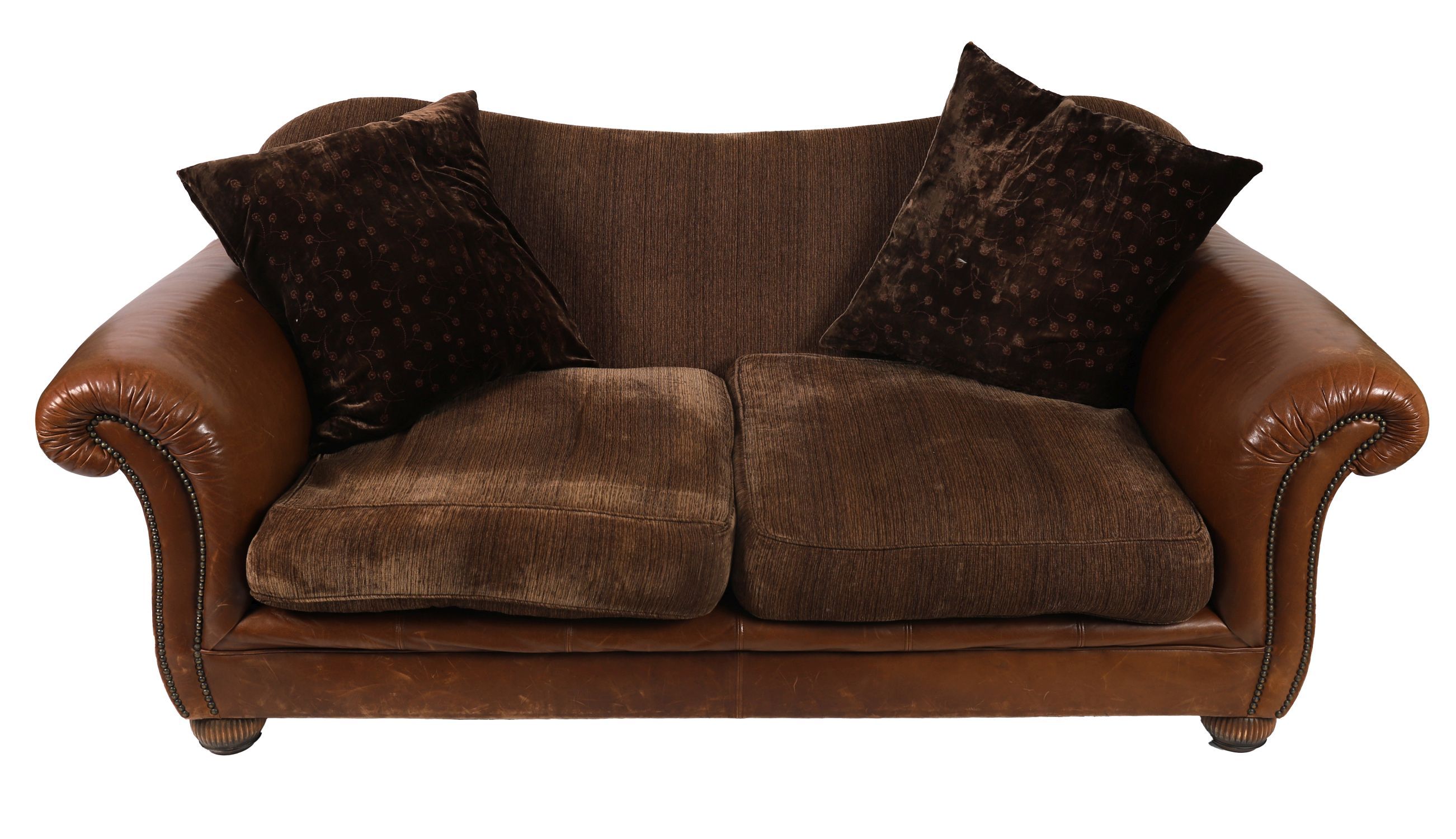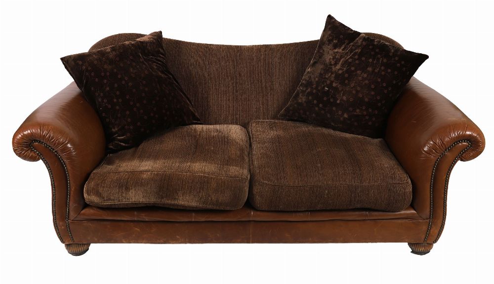 Pair of designer two-seater settees, upholstered in brown leather with textured chenille fabric seat and back cushions. Featuring rolled arms, studded borders, and plush loose cushions. Comfortable and stylish.