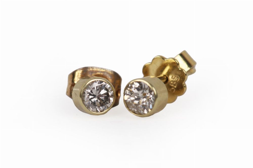 A pair of classic brilliant-cut diamond stud earrings, rub-over set, with a combined total diamond weight of approximately 0.6 ct.