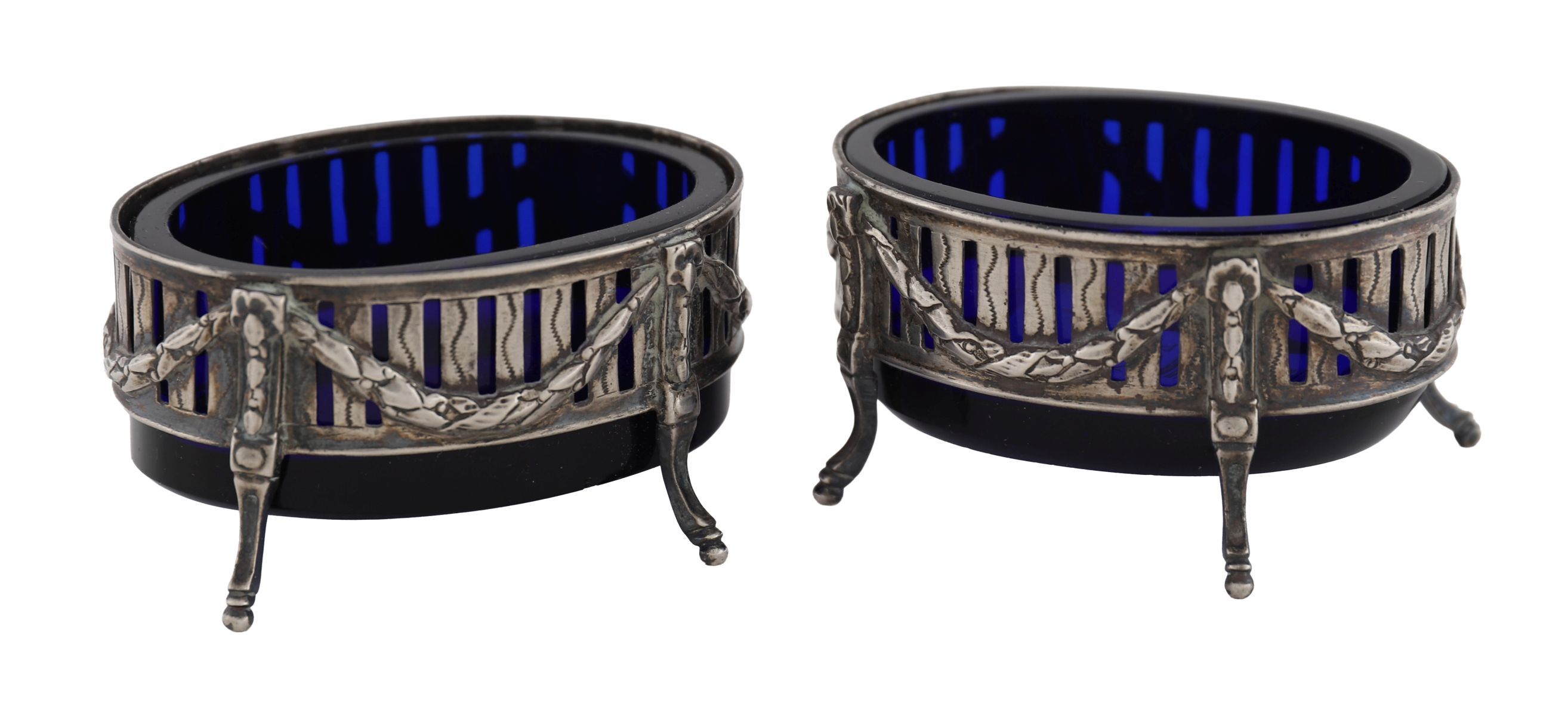 A pair of Directoire-period French silver salts with pierced galleries, each with original cobalt-blue glass liner.