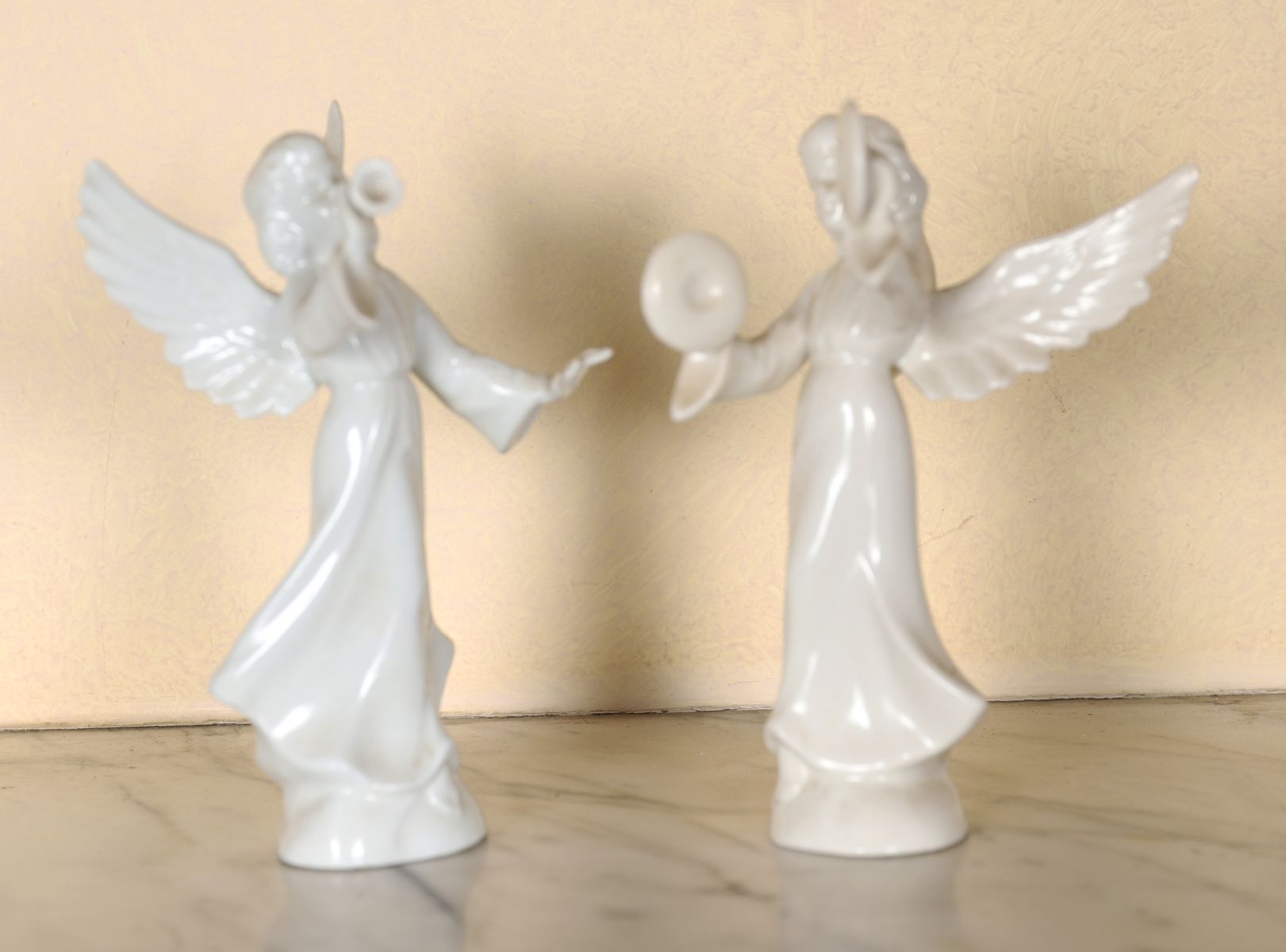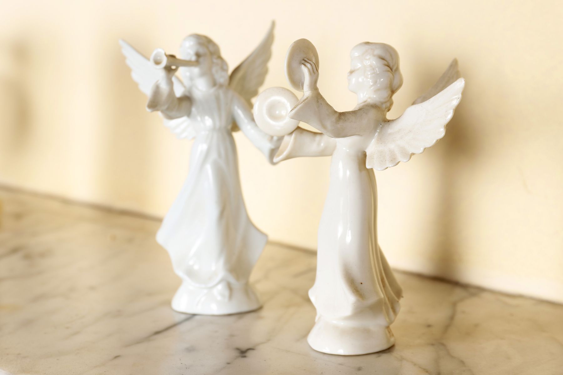 A pair of Dresden blanc de chine porcelain angel figures, each modelled standing, holding symbolic attributes, with glazed finish and fine detailing. 20th century.