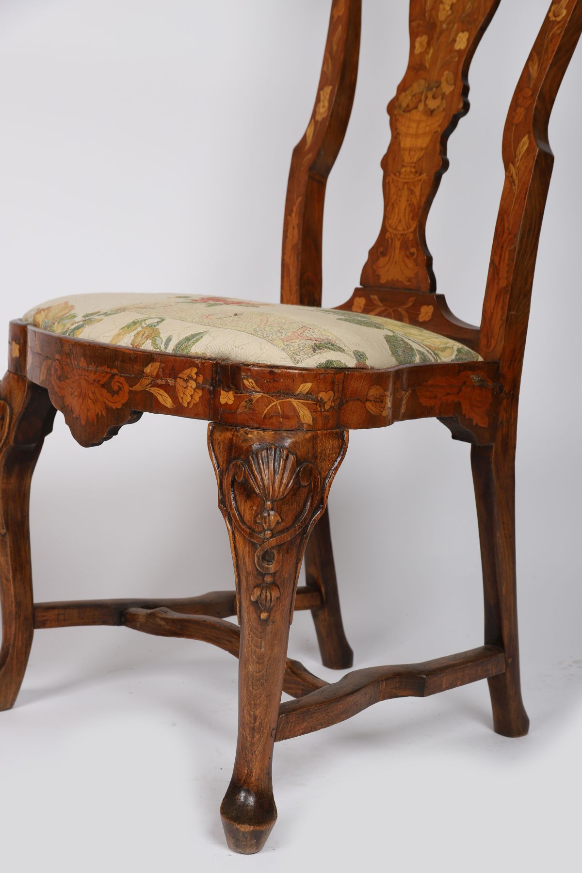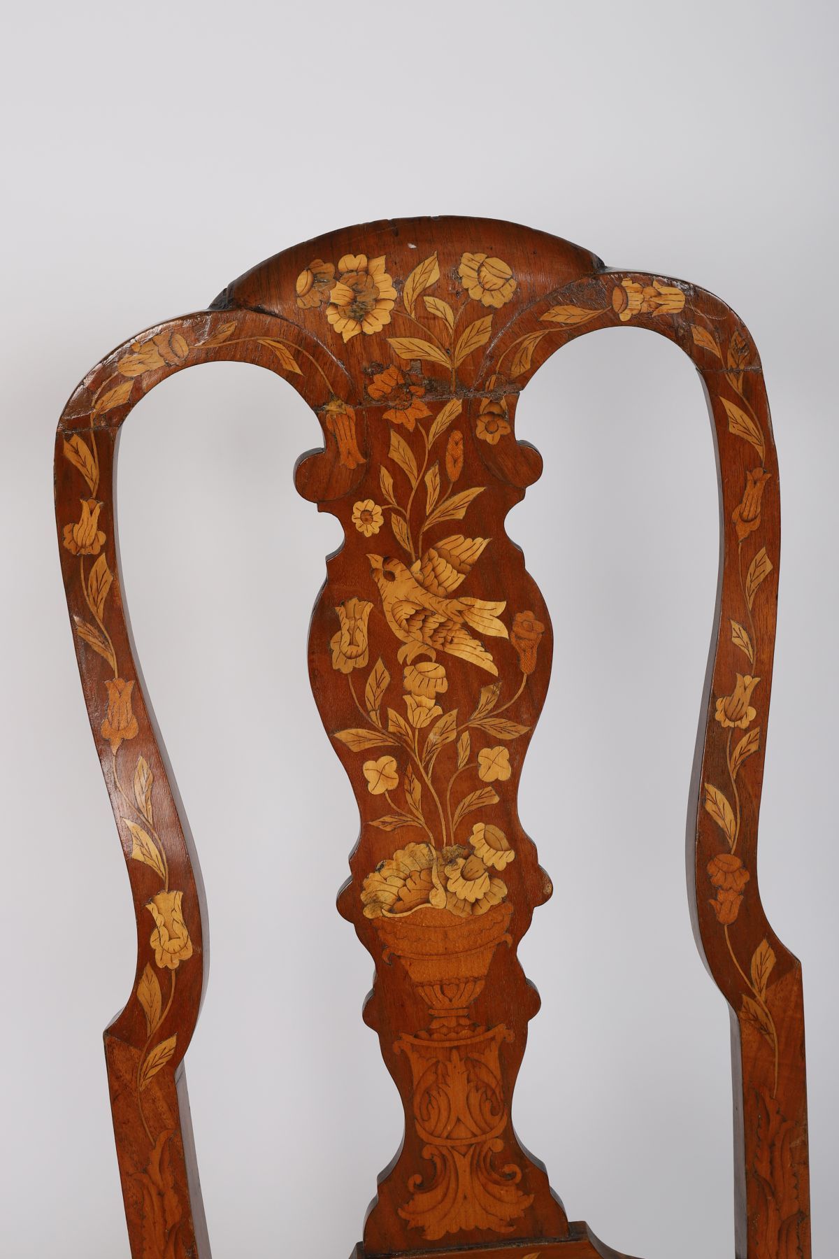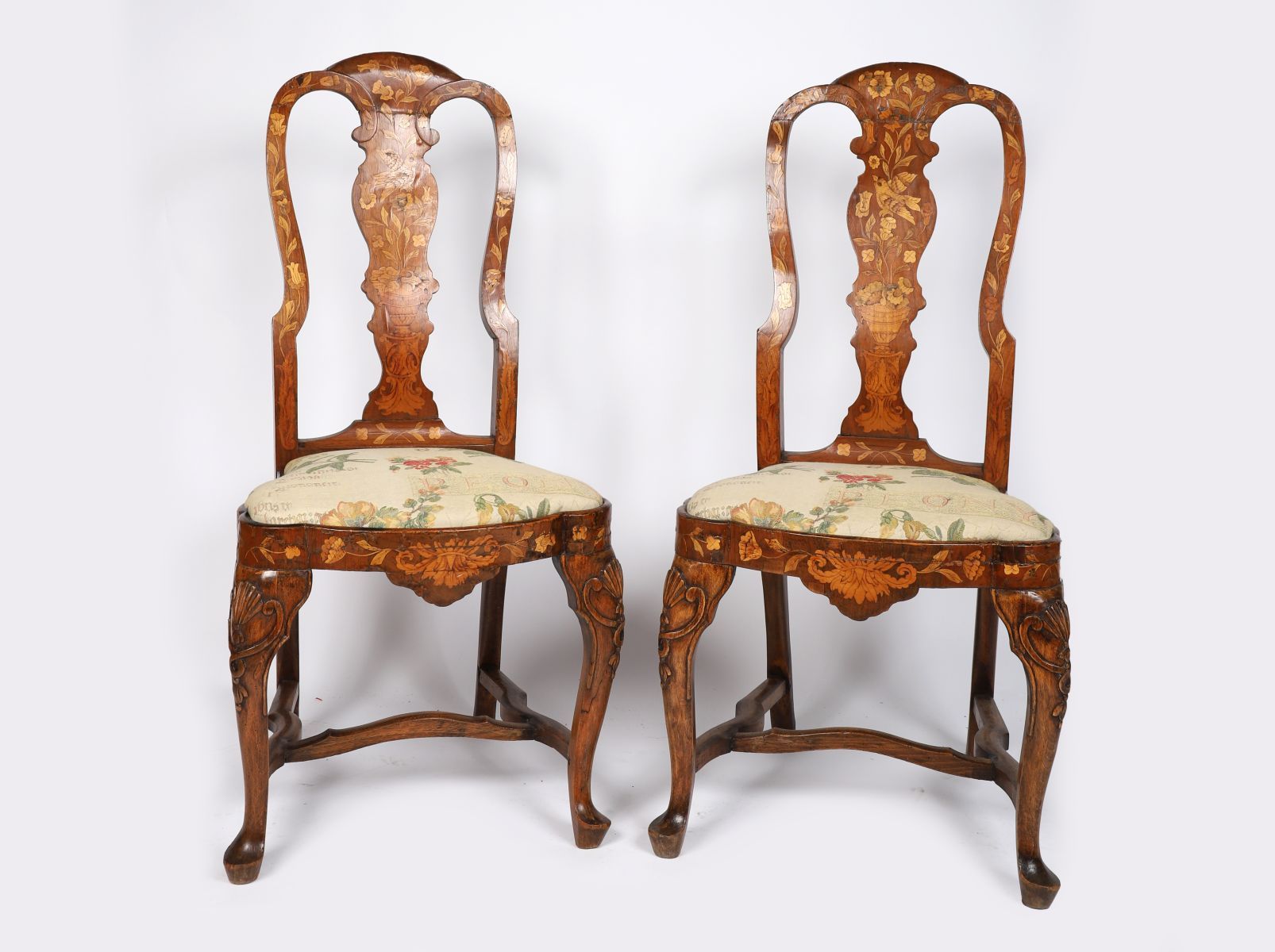 18th-century, each with a tall profusely inlaid back above a shaped drop-in seat.