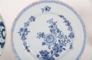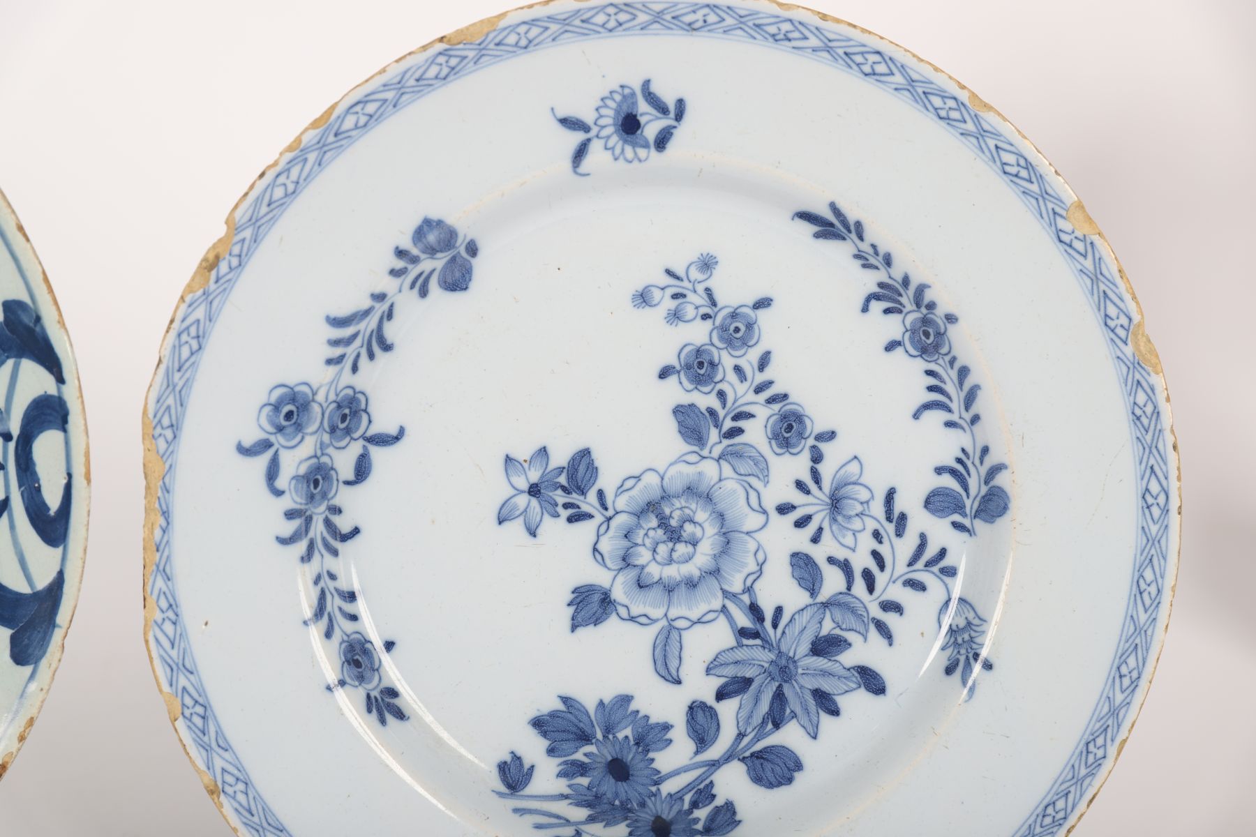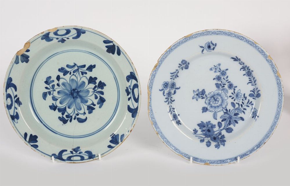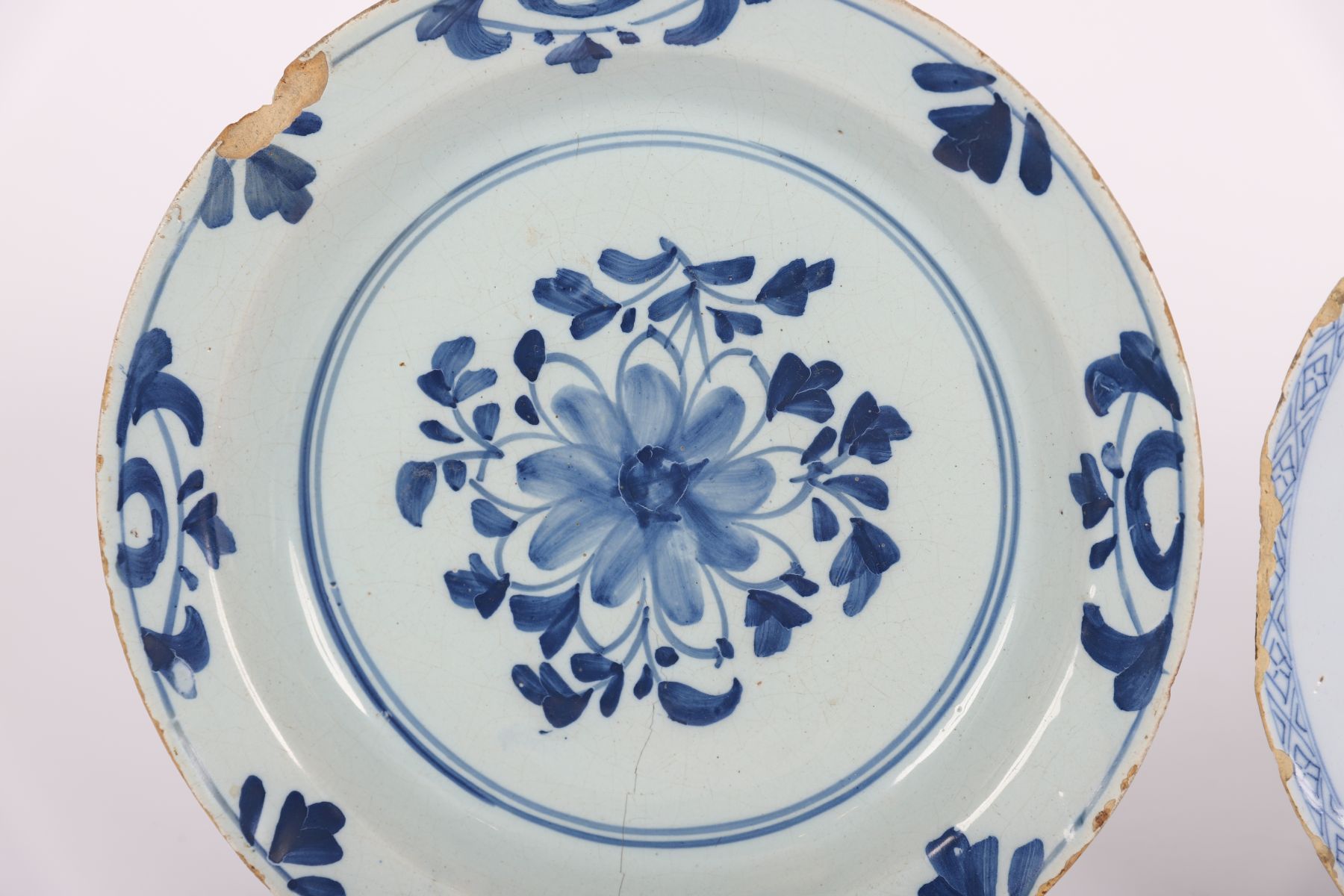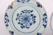 A pair of early 17th-century delft pancake plates, each decorated with floral motifs in cobalt blue, one with a central flowerhead within stylised borders, the other with trailing blossoms framed by a patterned rim. Both showing characteristic fritting, rim chips, and glaze imperfections typical of the period.