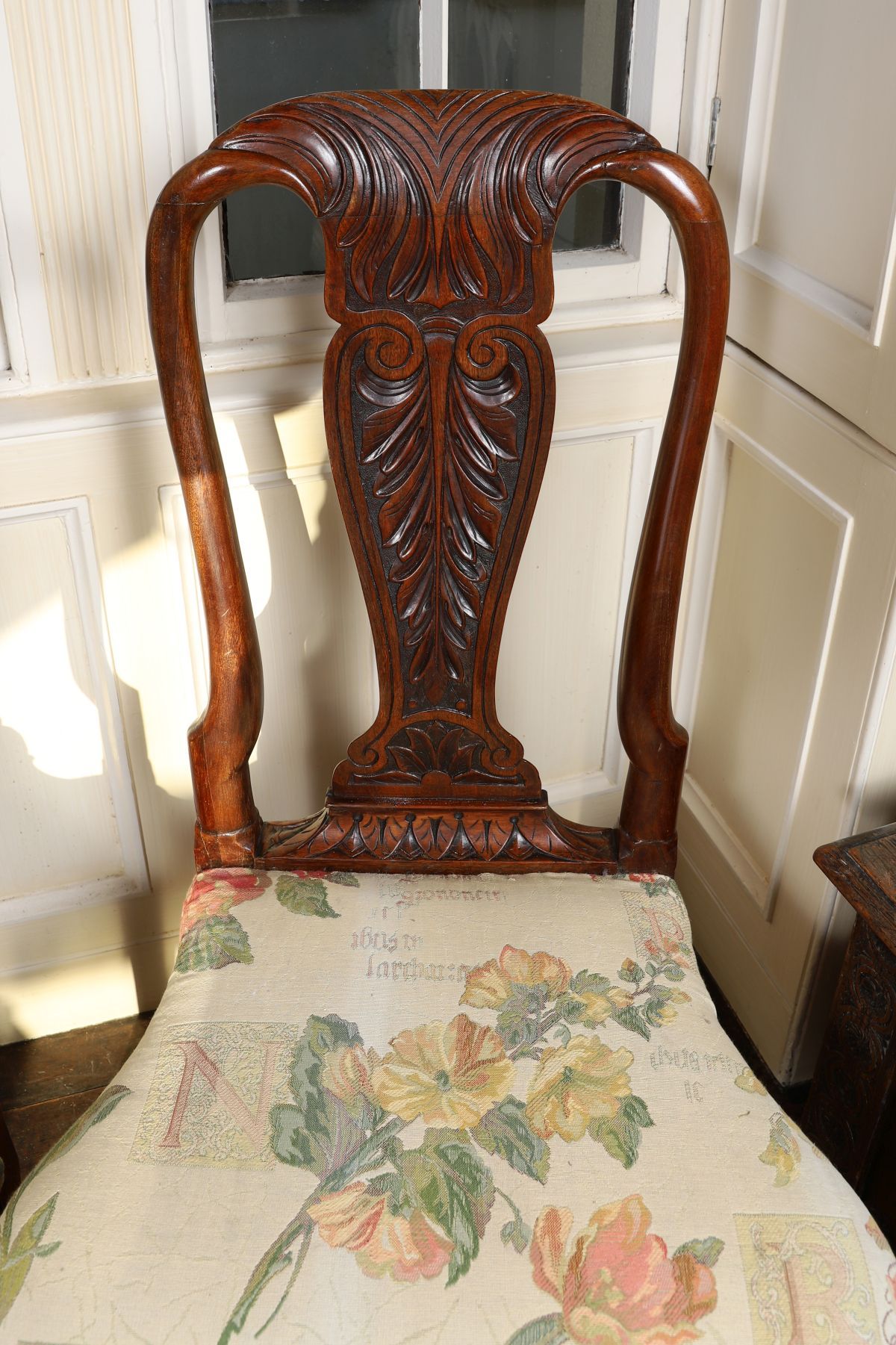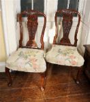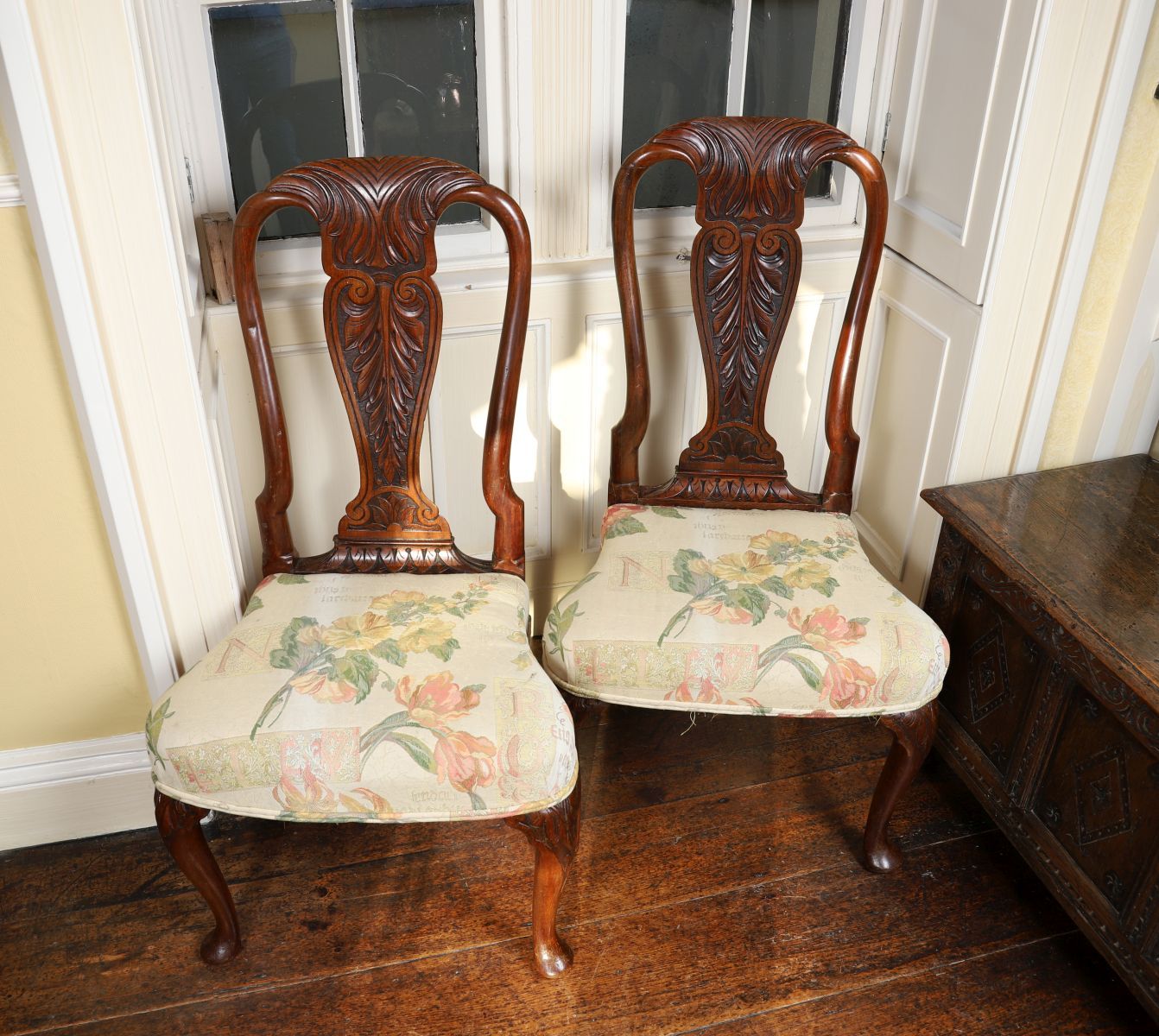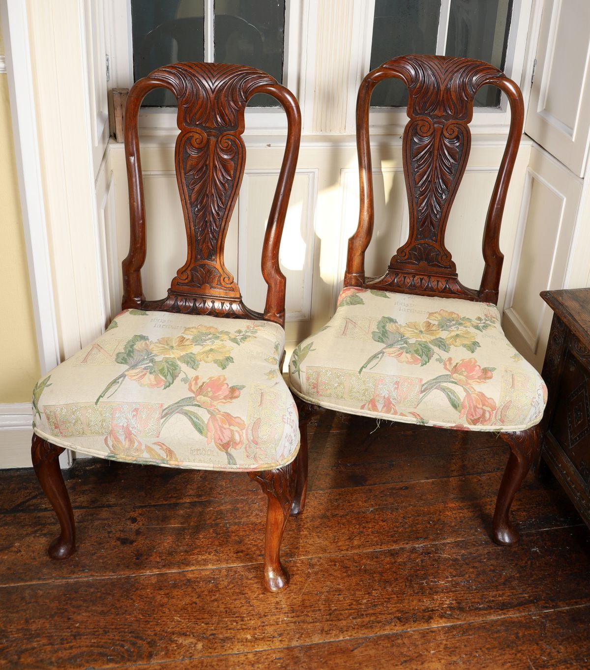 Pair of carved oak side chairs with shaped backs and seats, raised on cabriole legs joined by stretchers.