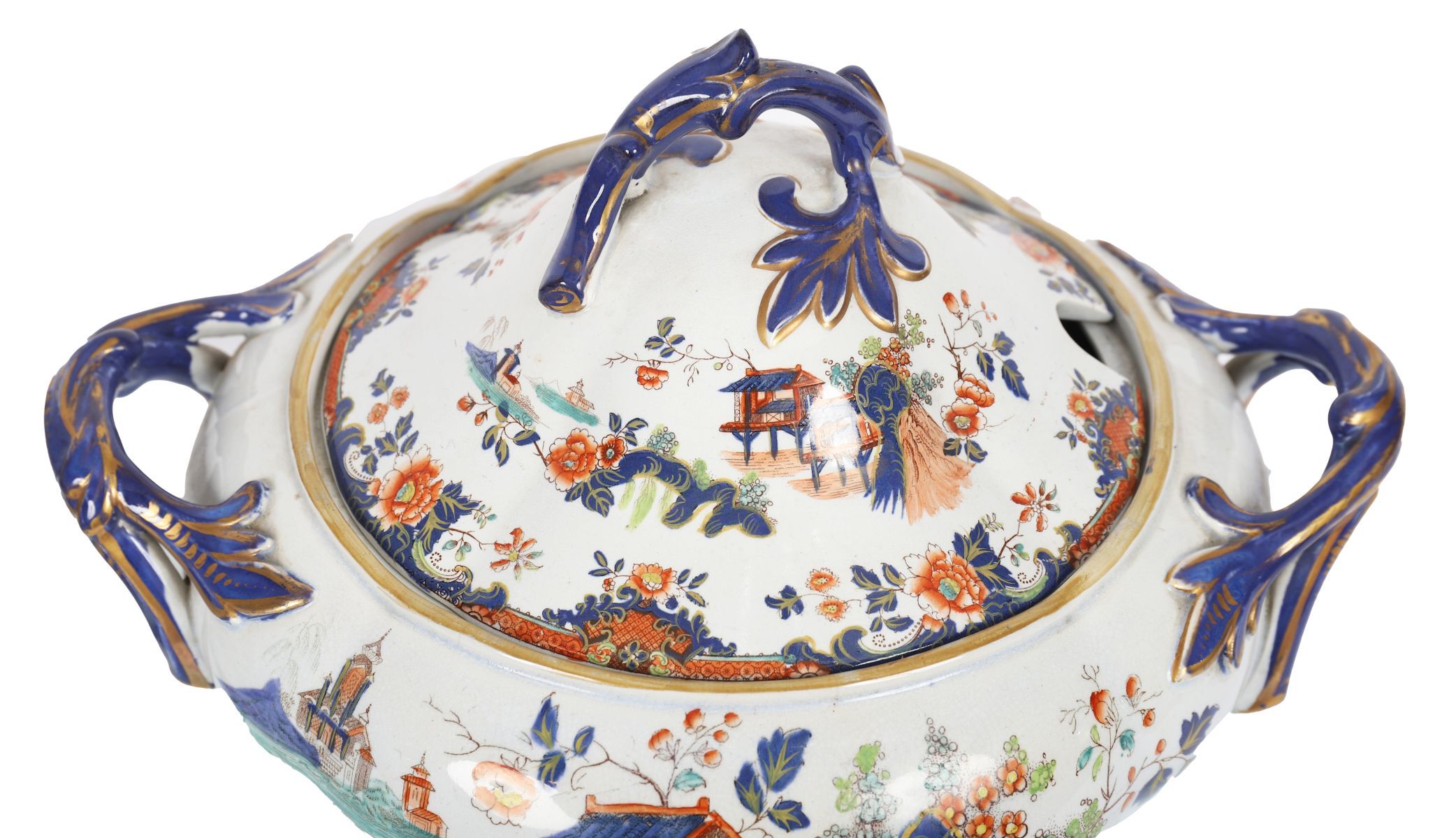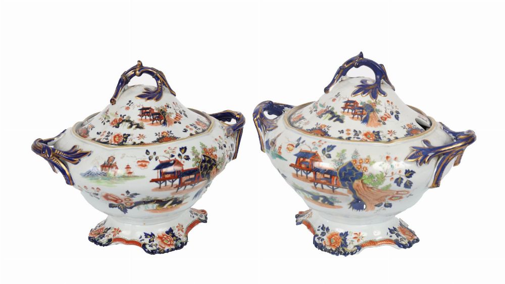 Finely painted ironstone tureens with matching stands, decorated in the Imari palette with floral and pagoda motifs, each with scroll handles and knop finials.