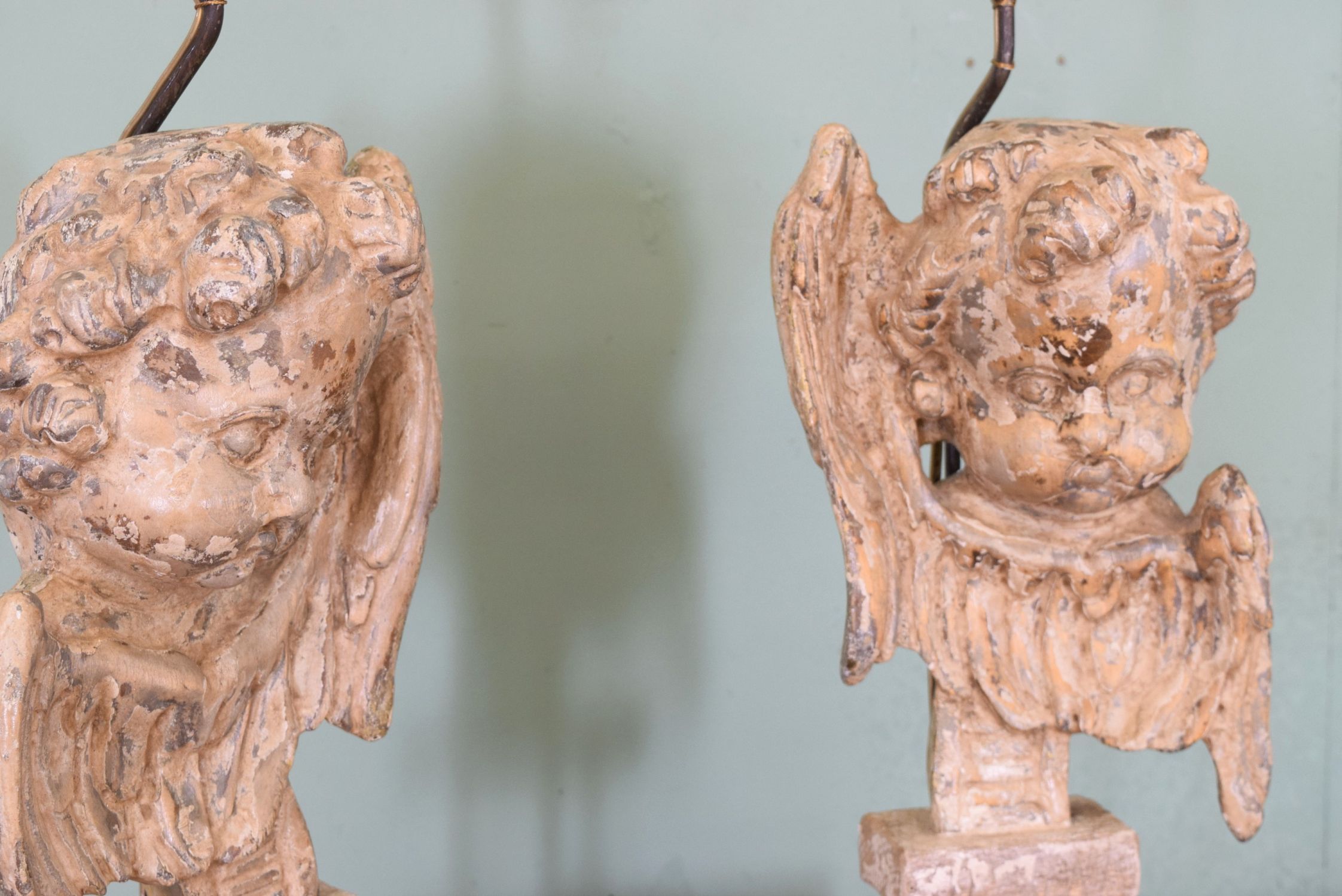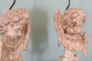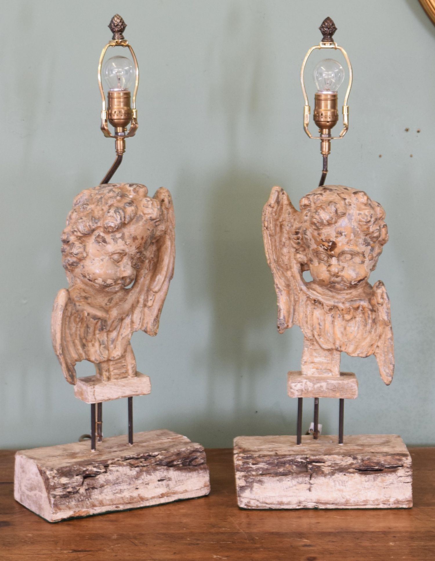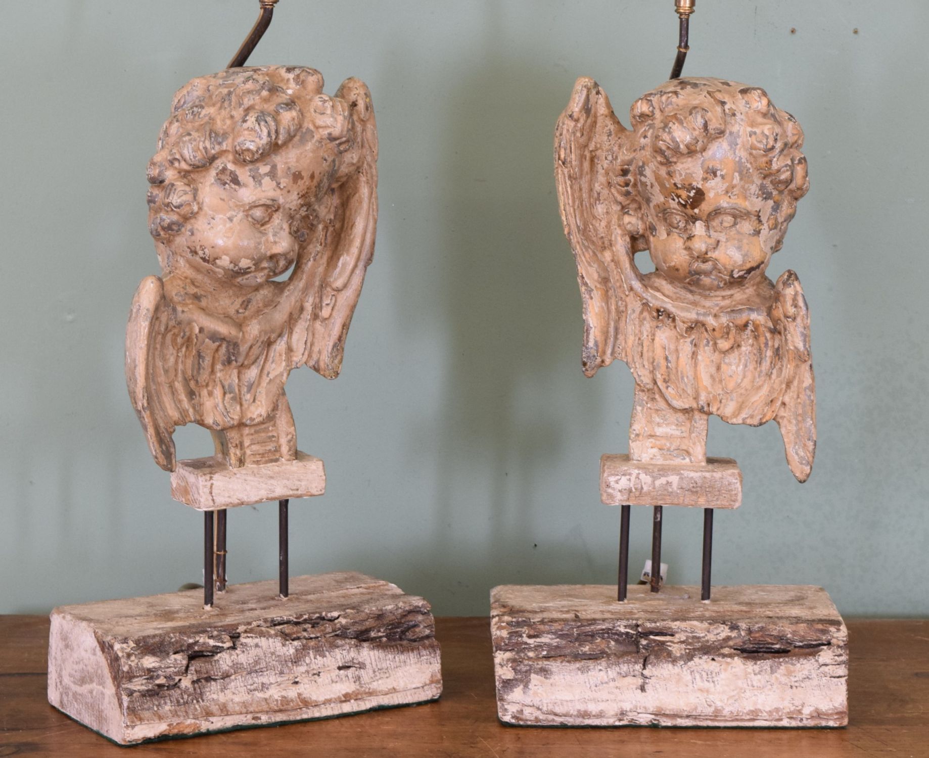 A pair of carved wooden cherub-head figures with wings, early fragments adapted as table lamps, each mounted on a rustic timber plinth with modern fittings.
