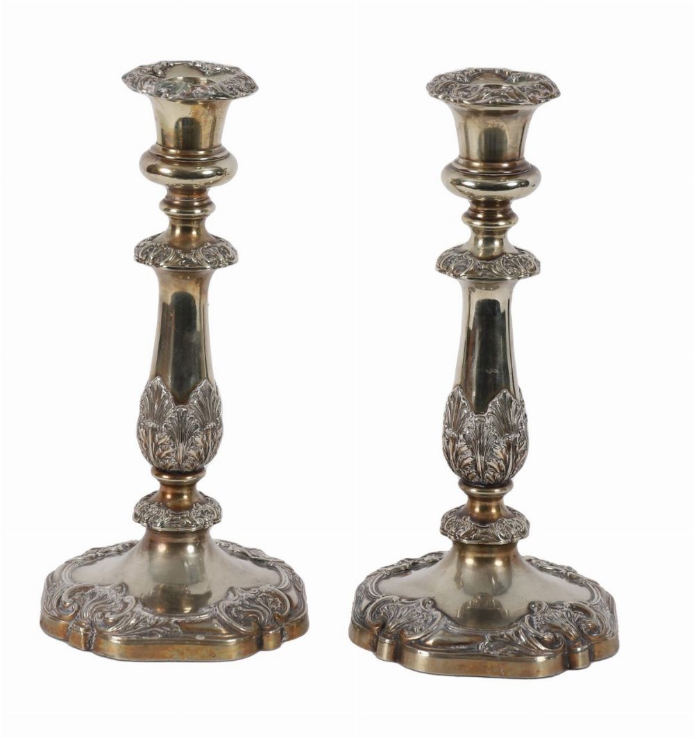 Pair of early 19th-century Sheffield plate candlesticks with foliate decoration and stepped bases.