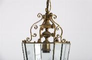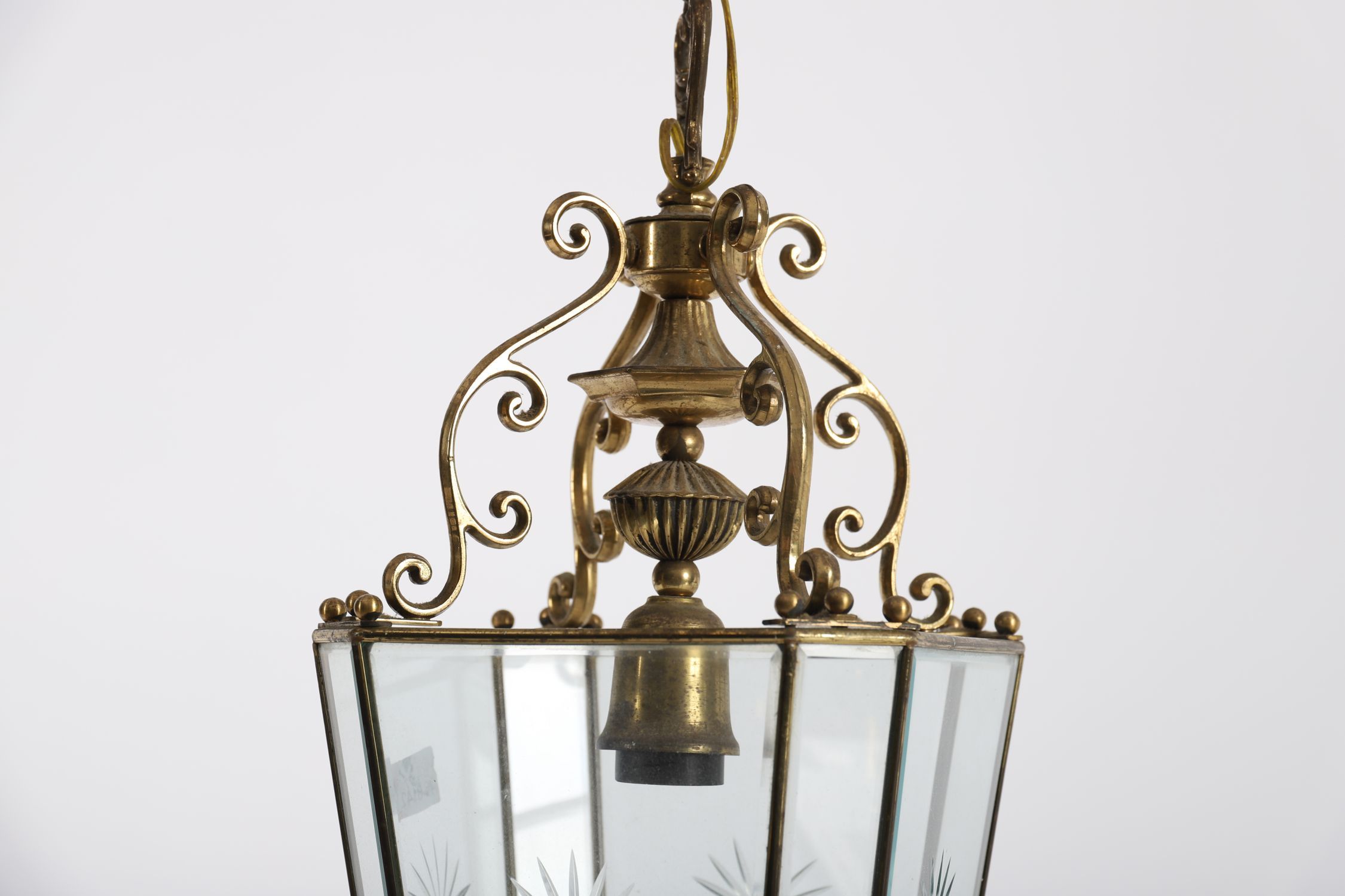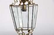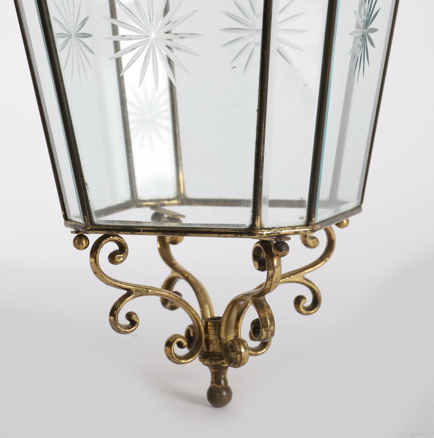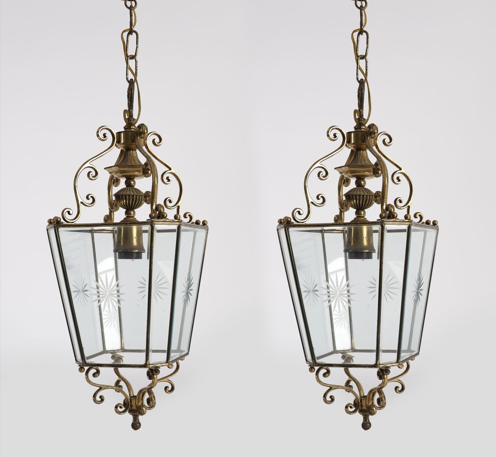 A pair of hexagonal Edwardian ceiling lanterns in polished brass, each with star-etched bevelled glass panels and decorative scrolled galleries with finials.