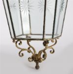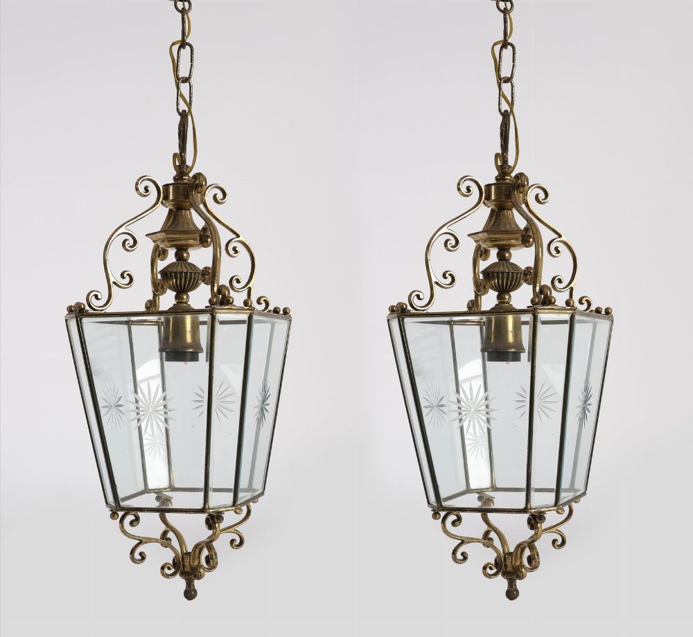 Lot 1594 PAIR OF EDWARDIAN BRASS AND ENGRAVED GLASS HALL LANTERNS