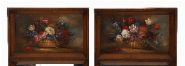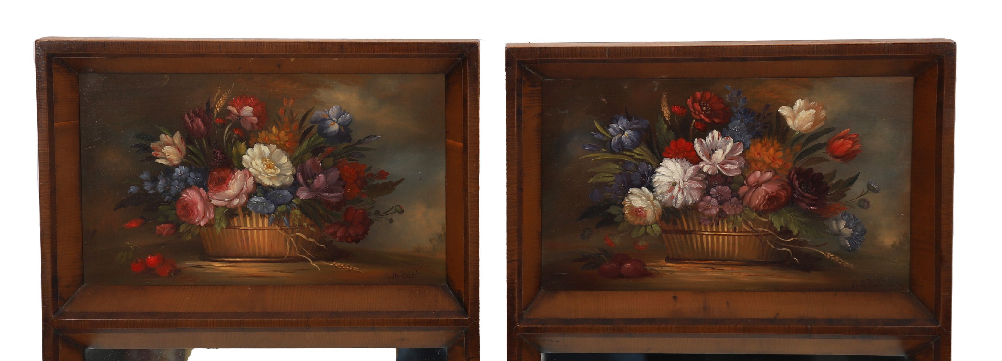 Each with a rectangular plate within a chamfered frame below a painted panel depicting a still life, each signed E.M. Ball.