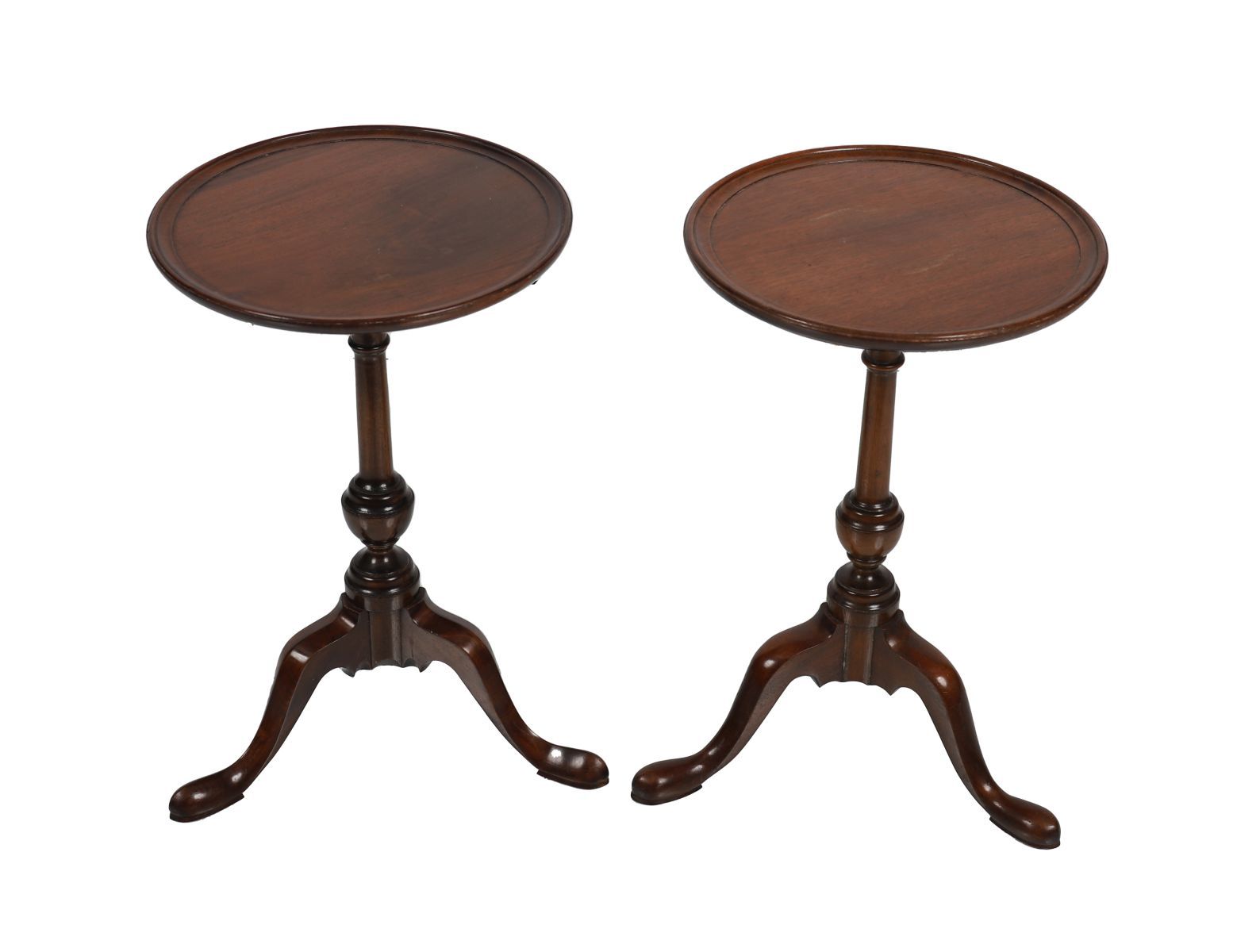 A pair of Edwardian mahogany tripod wine tables, each with circular tops on turned supports and tripod bases terminating in pad feet.