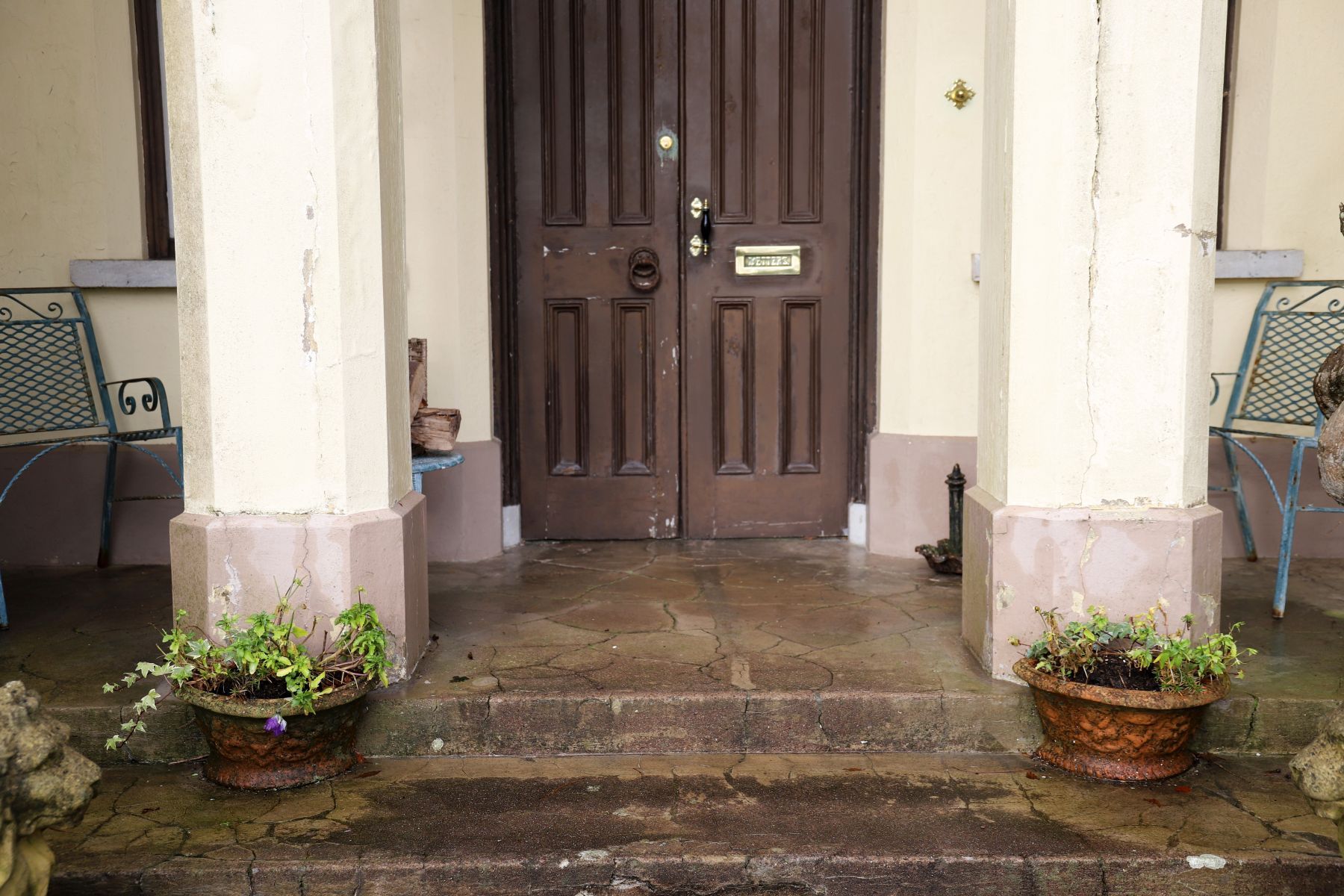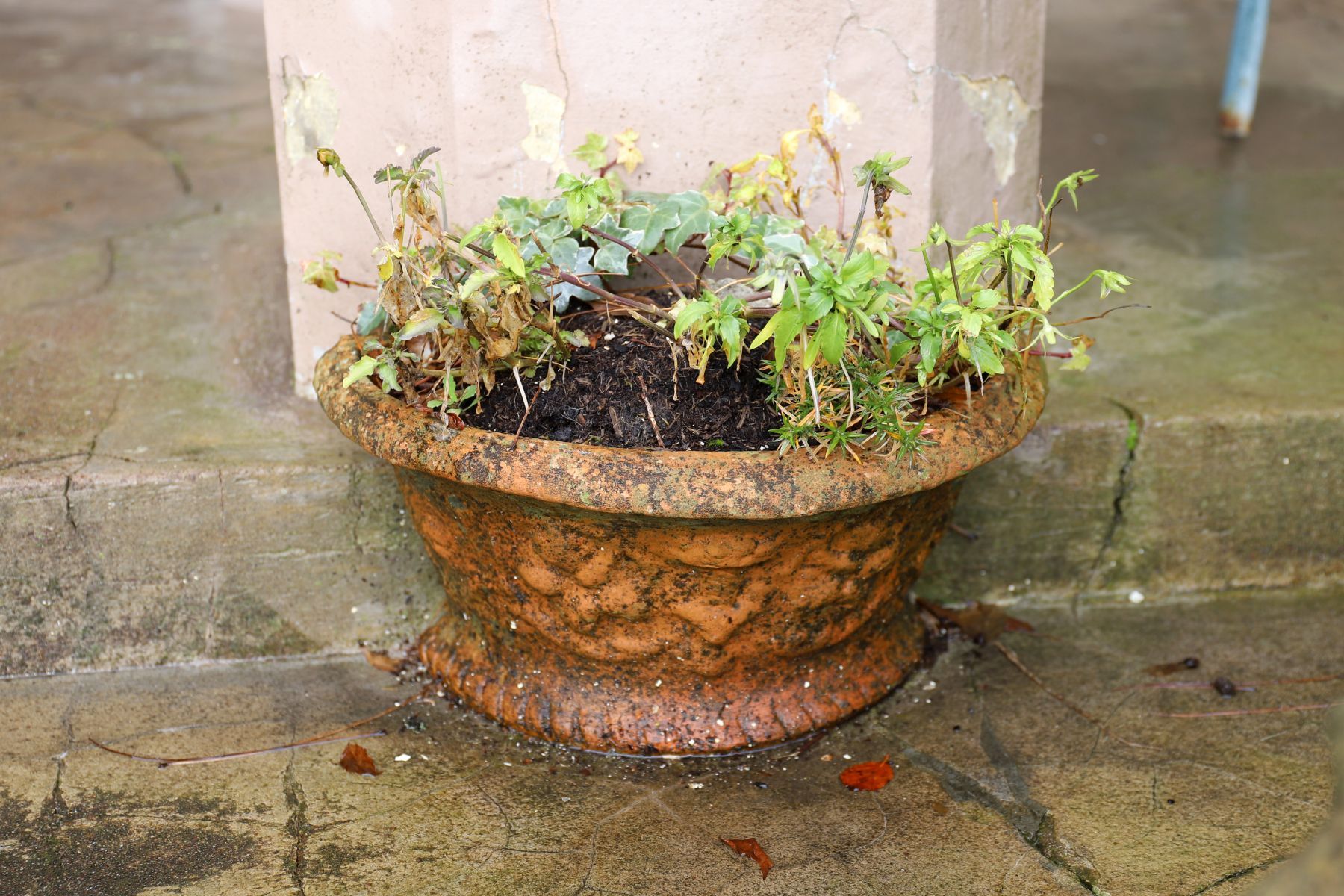 A matched pair of elliptical terracotta planters with moulded rims and weathered surfaces.