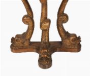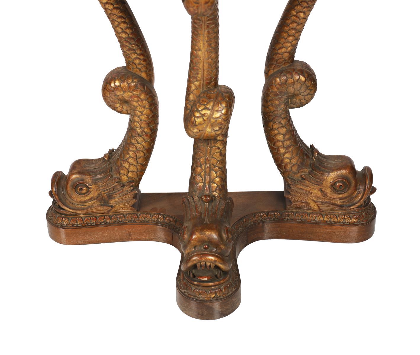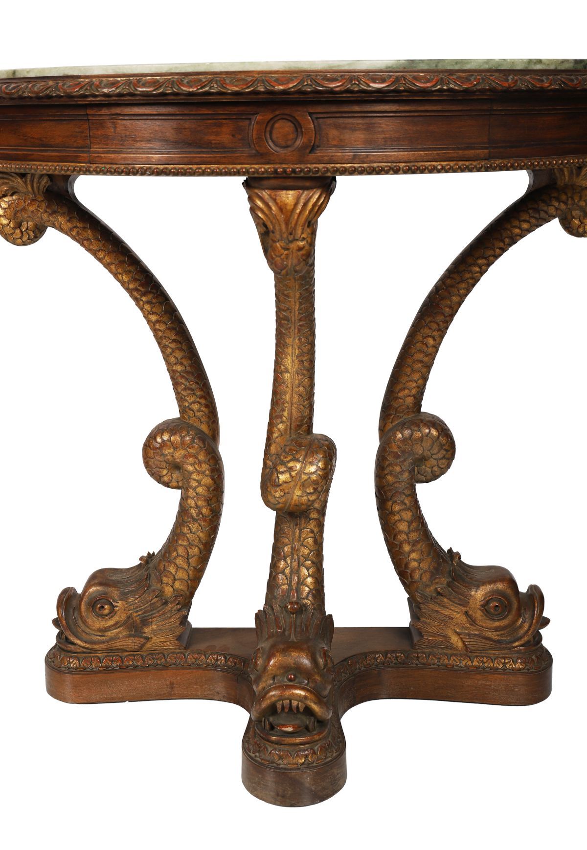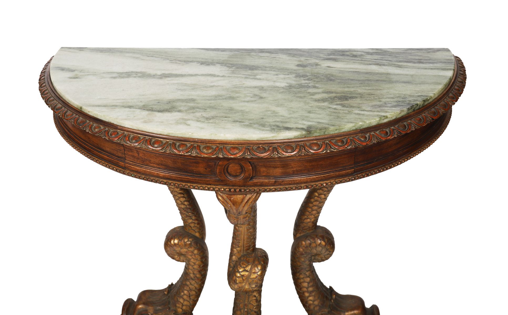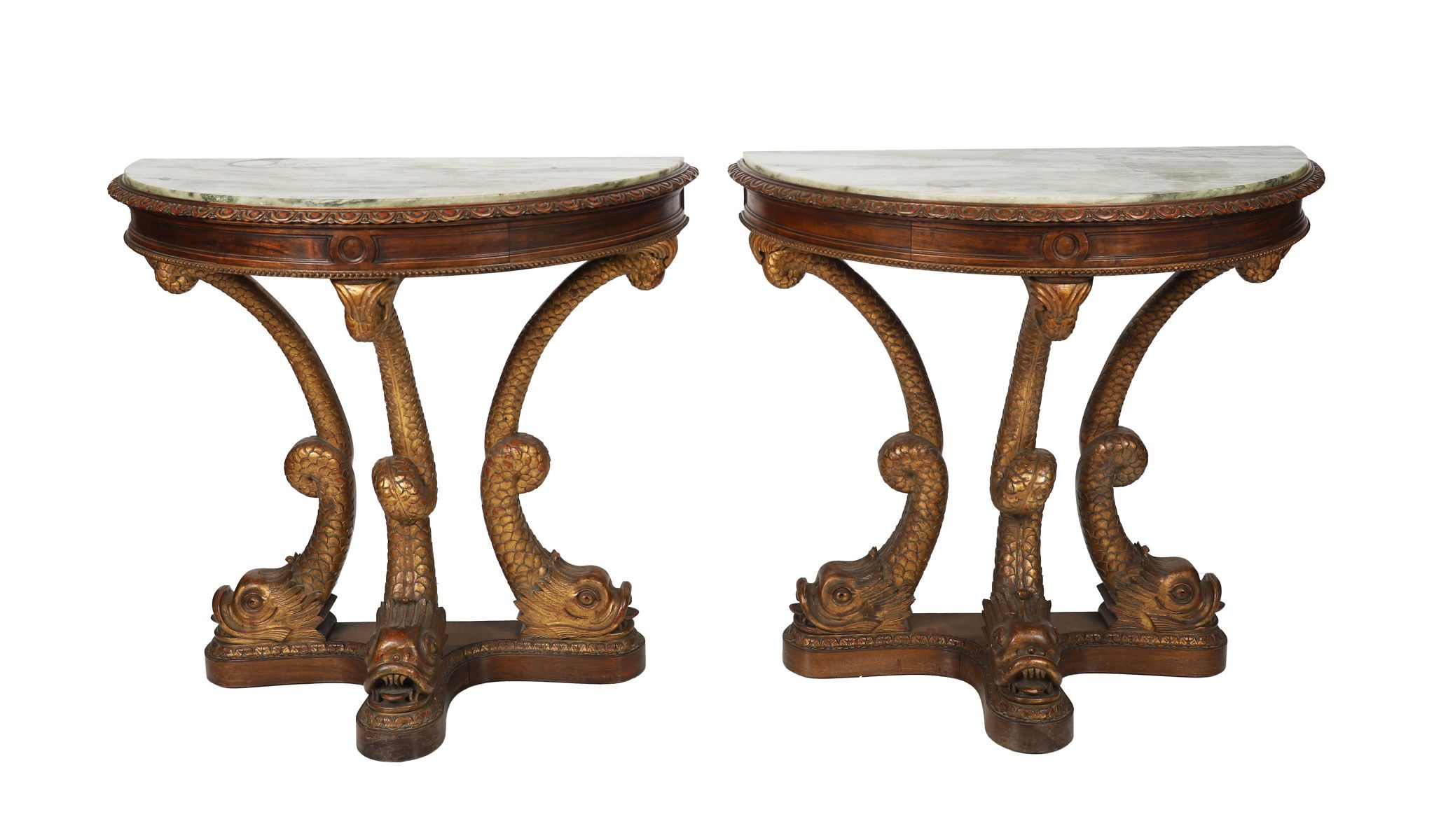 A pair of Empire-style mahogany and giltwood console tables, each with demi-lune top above carved dolphin-form supports with gilded scales and foliate bases, raised on a shaped plinth with beaded edge.