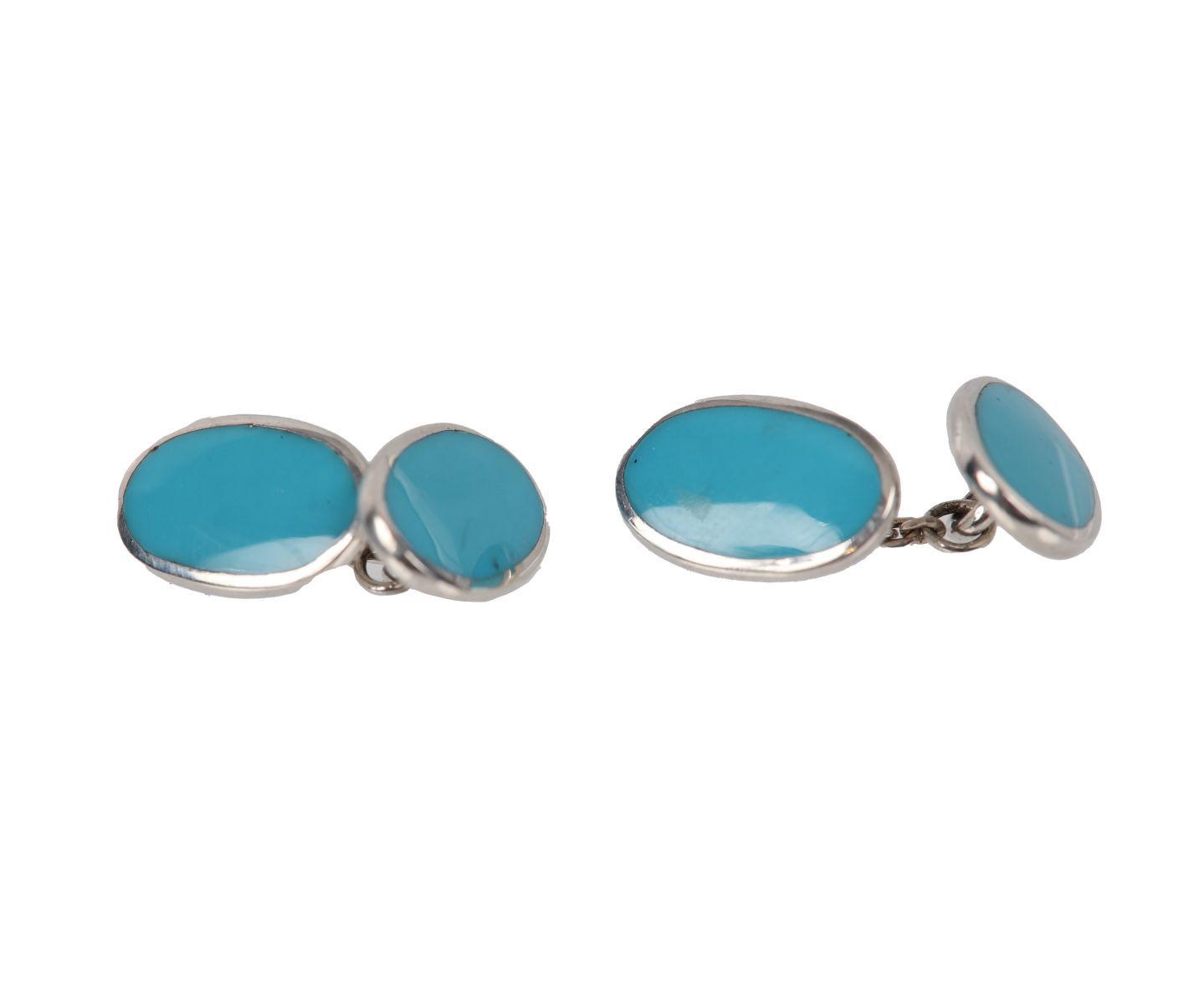 A pair of oval silver cufflinks, each with turquoise blue enamel face and chain-link backs, marked 925.