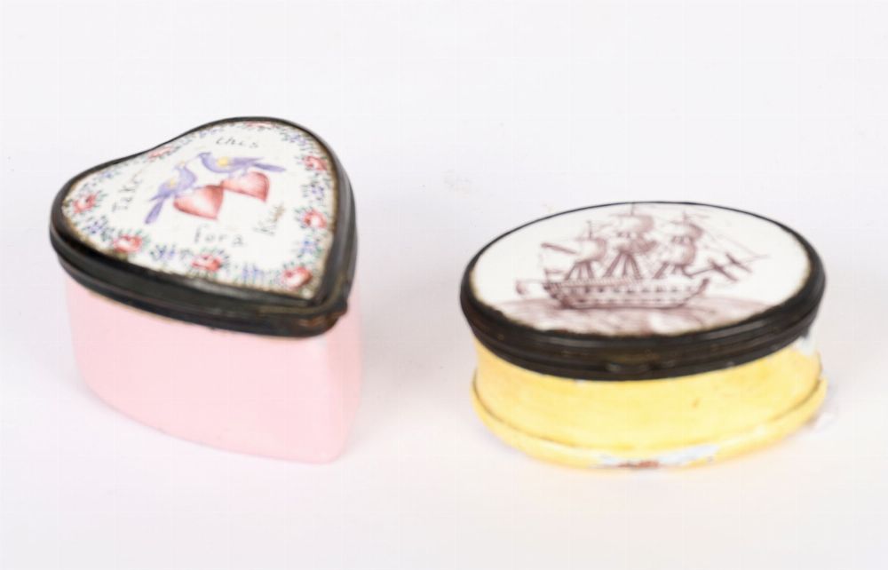 Two 18th century enamel snuff boxes, one heart-shaped with painted birds and motto “Take this for a Kissâ€, the other oval with ship decoration.