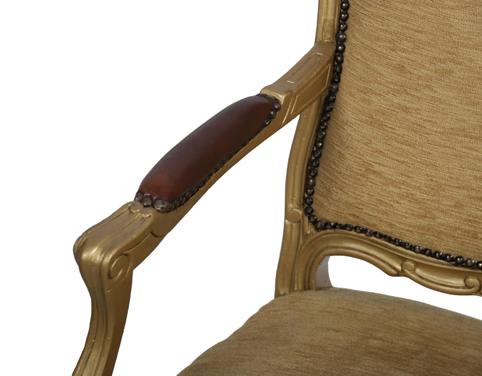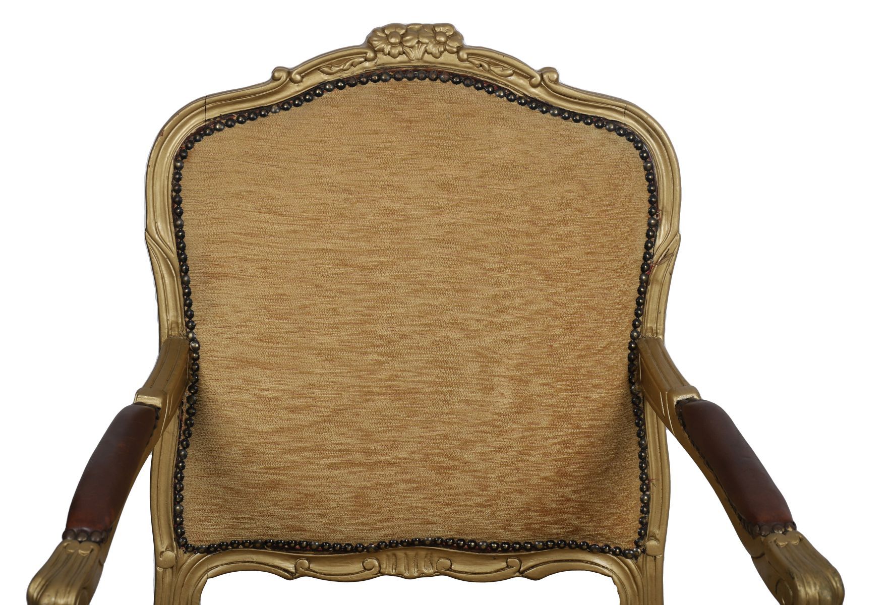 19th-century French giltwood salon chairs, the shaped backs and serpentine seats upholstered in gold-toned fabric, raised on cabriole legs.