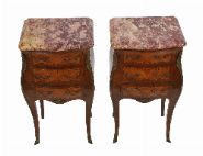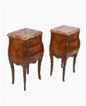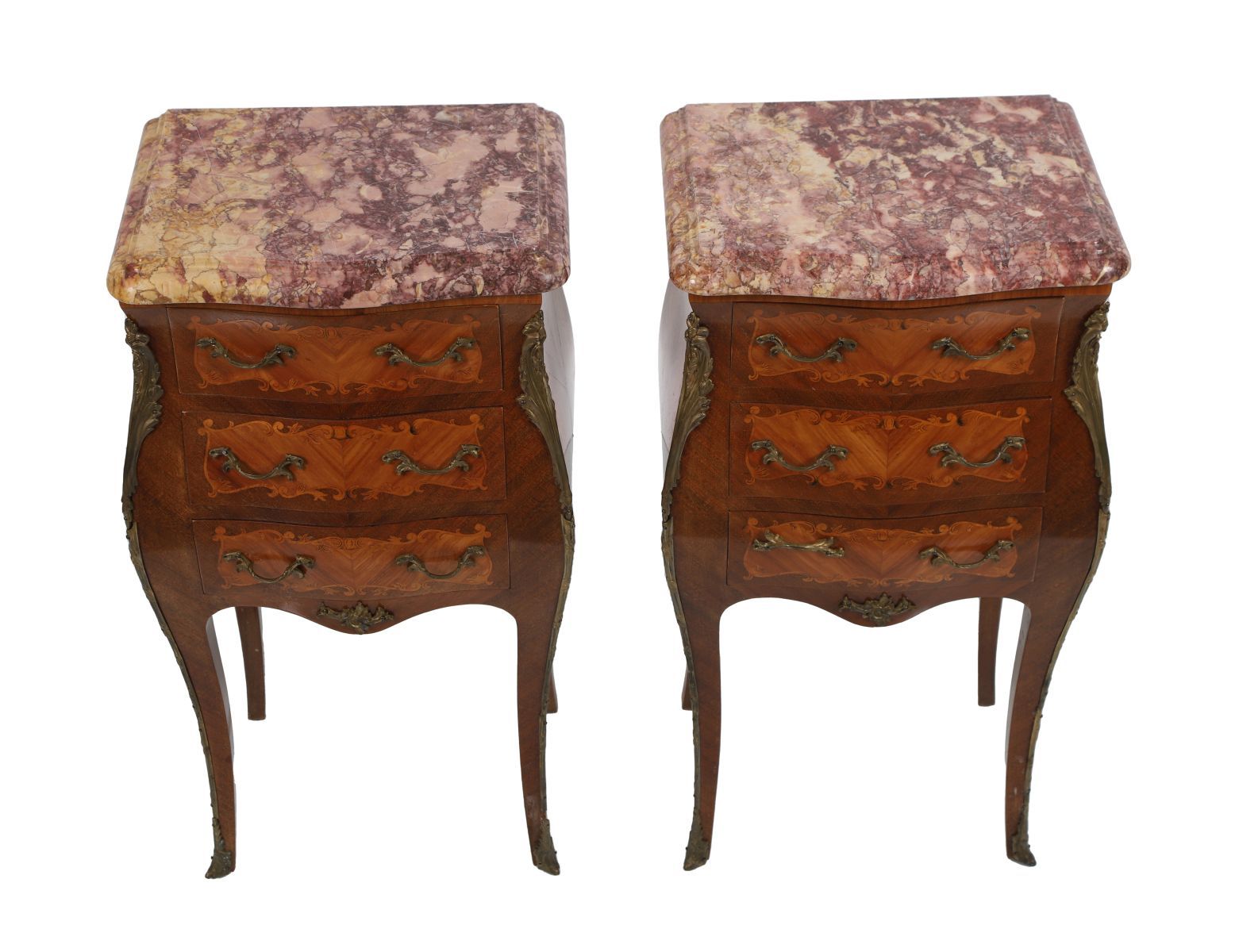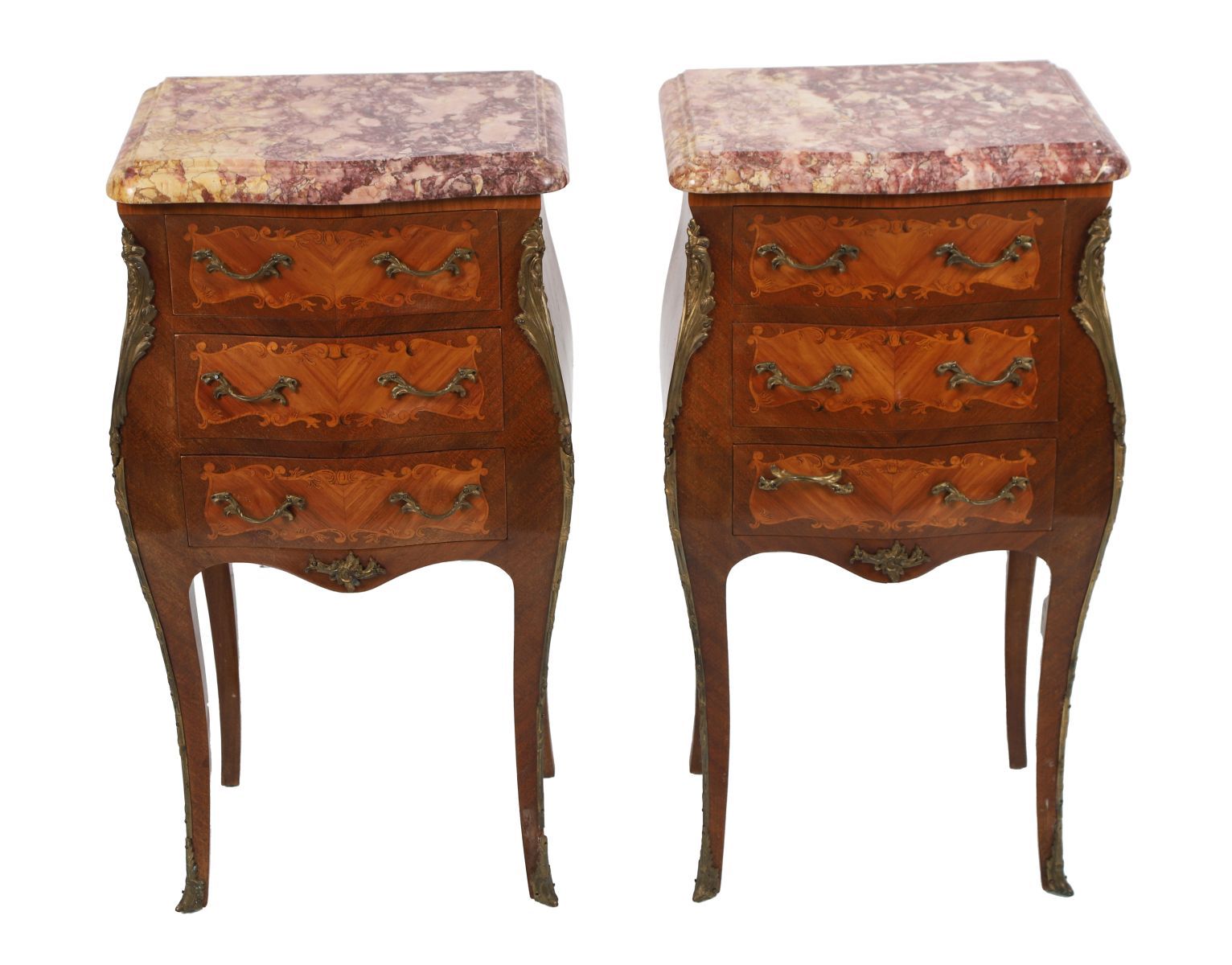 A pair of French bombé-shaped bedside commodes, veneered in kingwood and mounted with ormolu, each with a shaped marble top above three drawers fitted with rococo-style handles, raised on cabriole legs. Early 20th century.