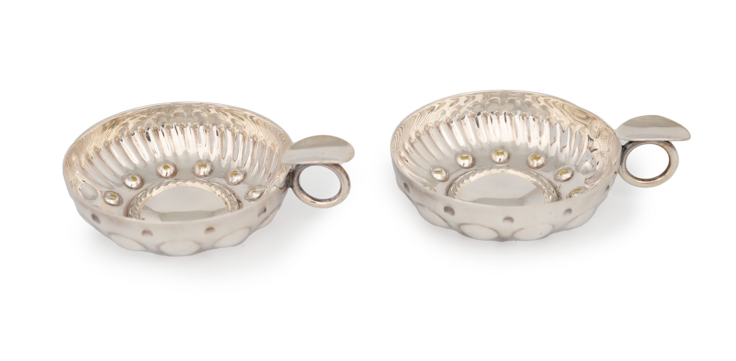 each with repousse decoration and ring handle.