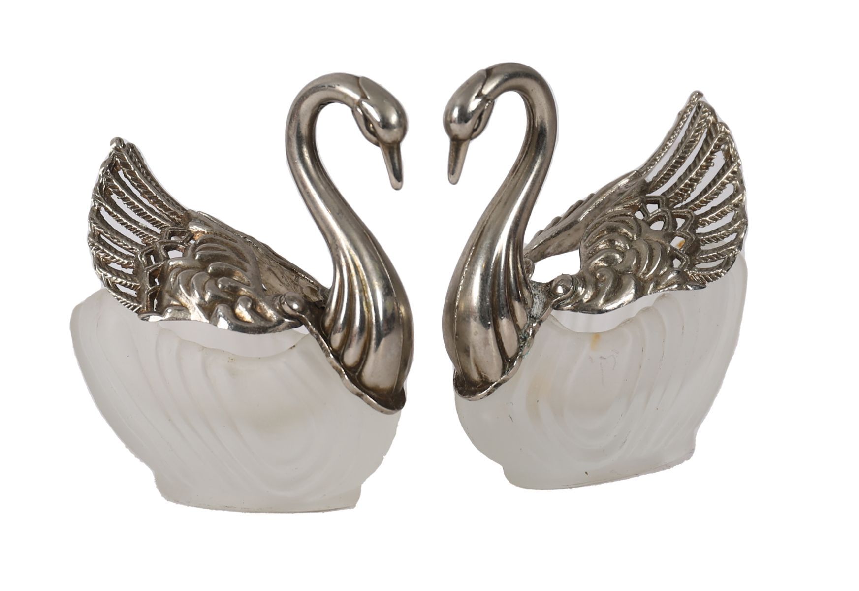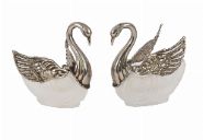 Pair of silver-plated swan-form open salts with removable frosted glass liners.