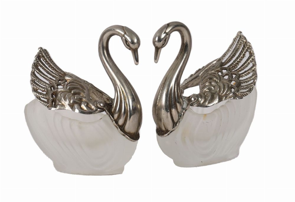 Lot 537 PAIR OF FRENCH SWAN-FORM SALT CELLARS — SILVER PLATE AND FROSTED GLASS