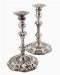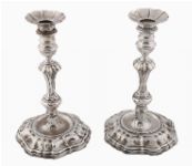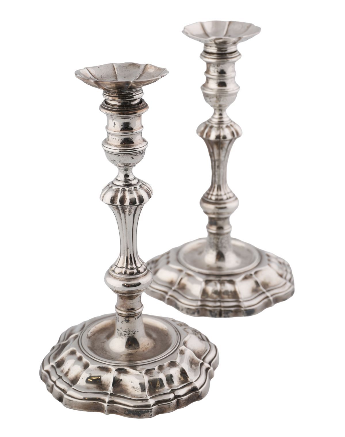 Lot 732 PAIR OF GEORGE II CAST SILVER CANDLESTICKS BY DAVID WILLAUME (II)