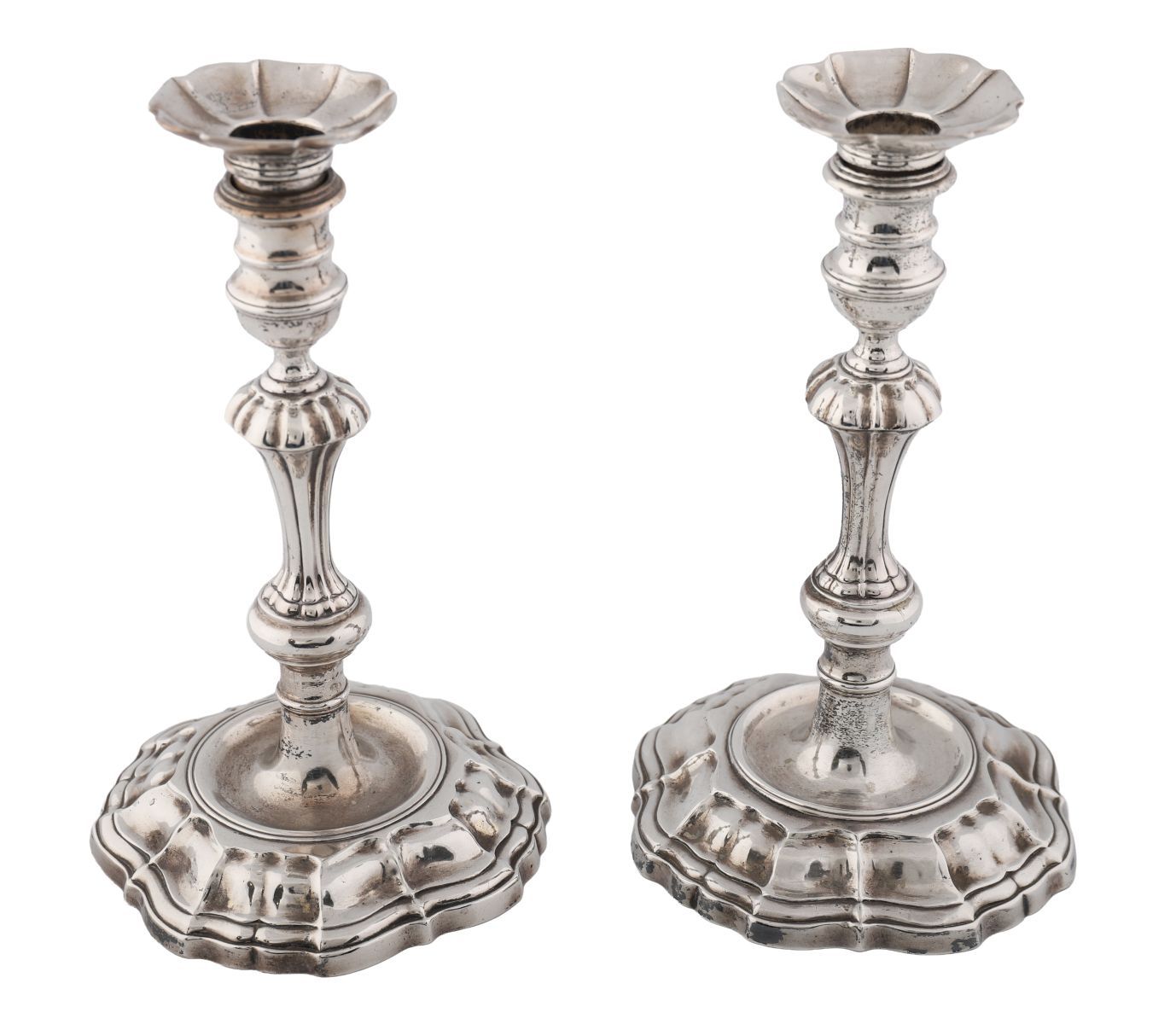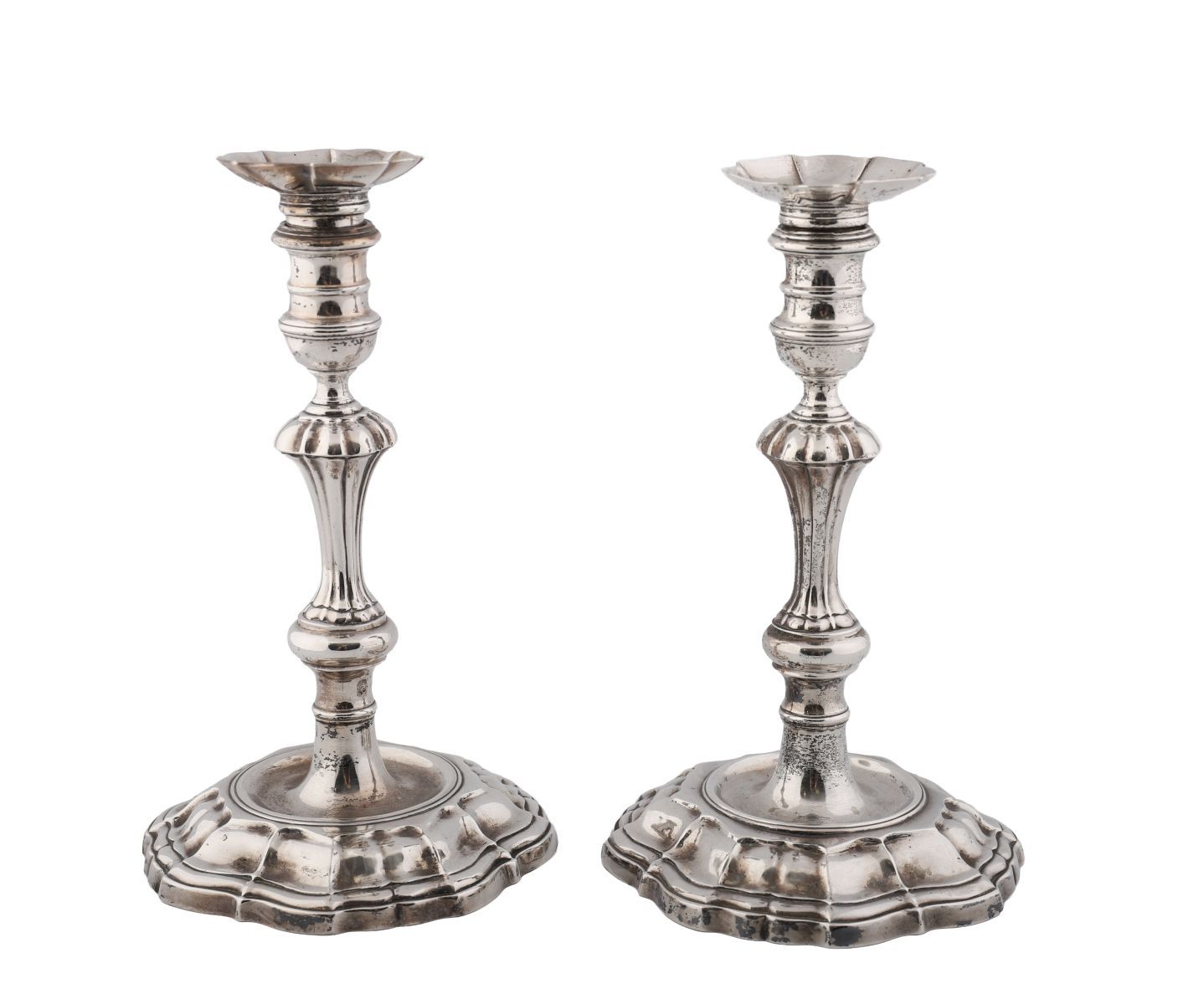 A fine pair of George II cast silver candlesticks by David Willaume II, London 1741, each with scalloped drip pans, knopped stems and shaped bases with stepped rims. Bearing traces of lion passant to one drip pan. Classic mid-18th century form with excellent gauge and patination.