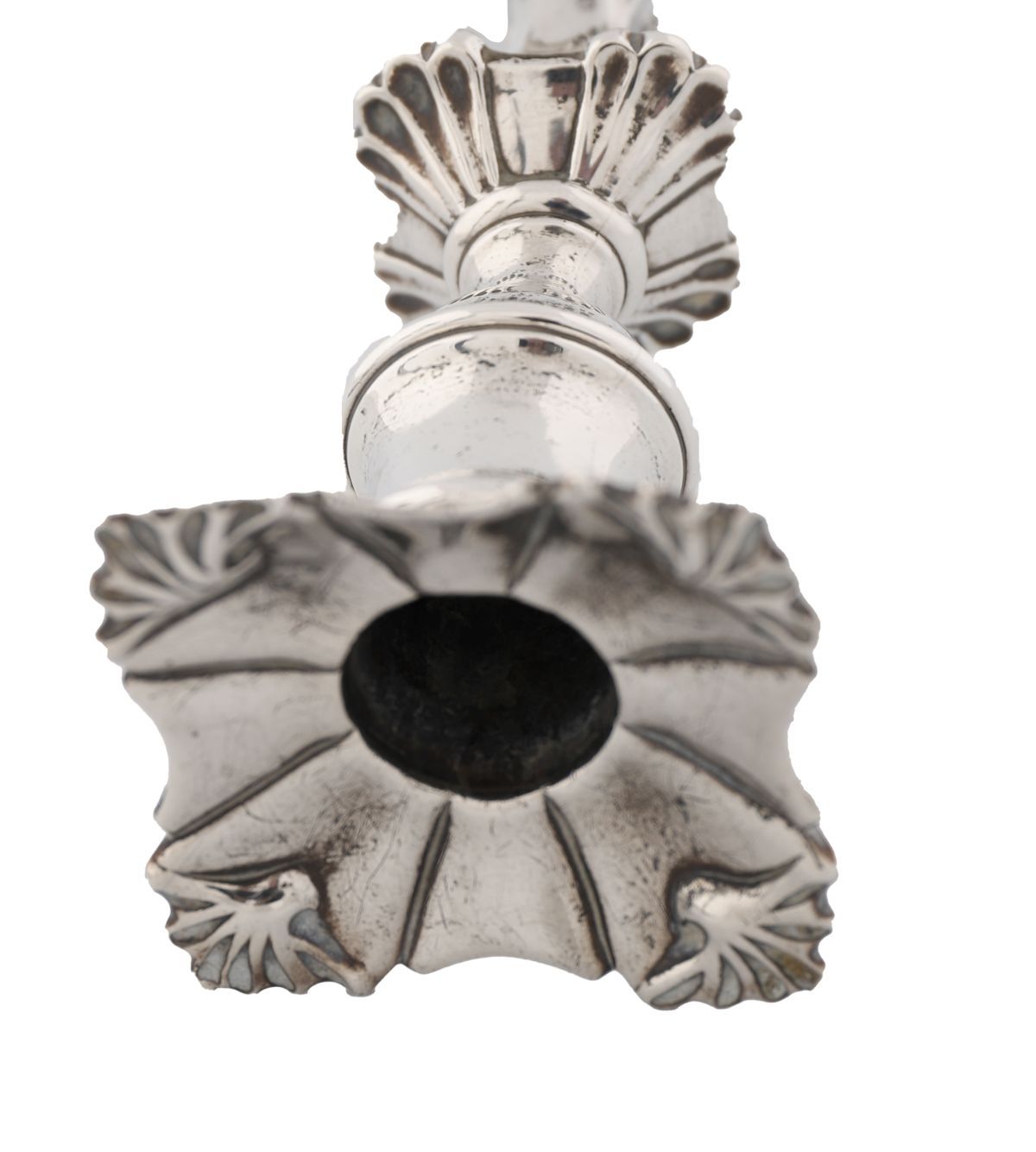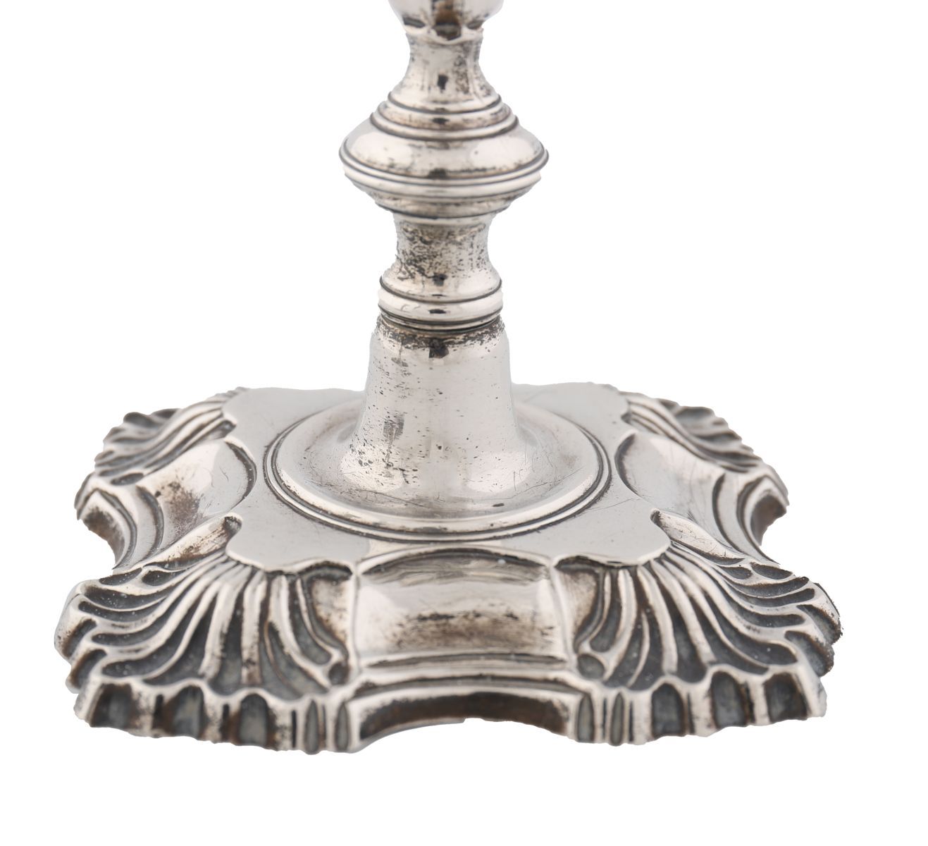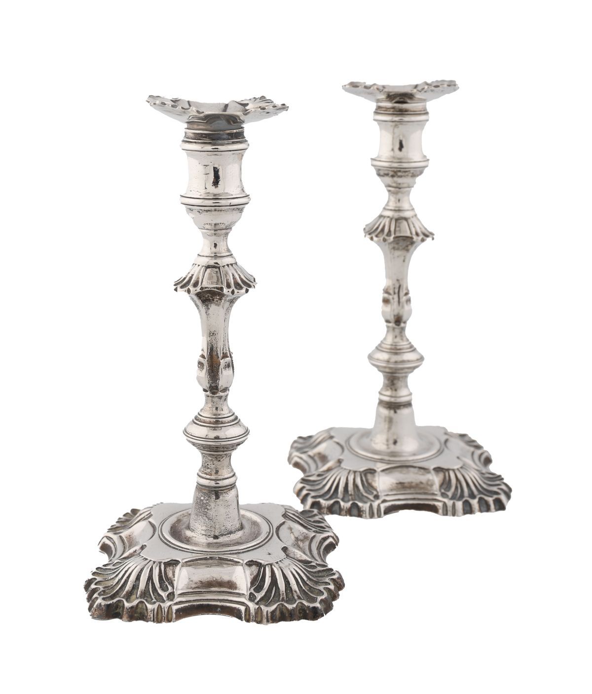 A pair of George II silver candlesticks, John Quantock, London, 1754. Each with square bases having shell corners, supporting tapering knopped stems, terminating in spool-shaped sconces with detachable nozzles. weight 24 oz