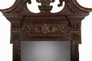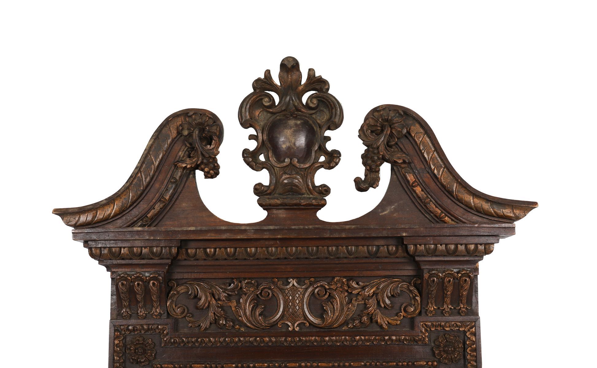Each mirror with arched and carved pediment centred by a vase finial and flanked by scrolls, richly decorated with foliate carving and gilded highlights, enclosing a rectangular mirror plate.