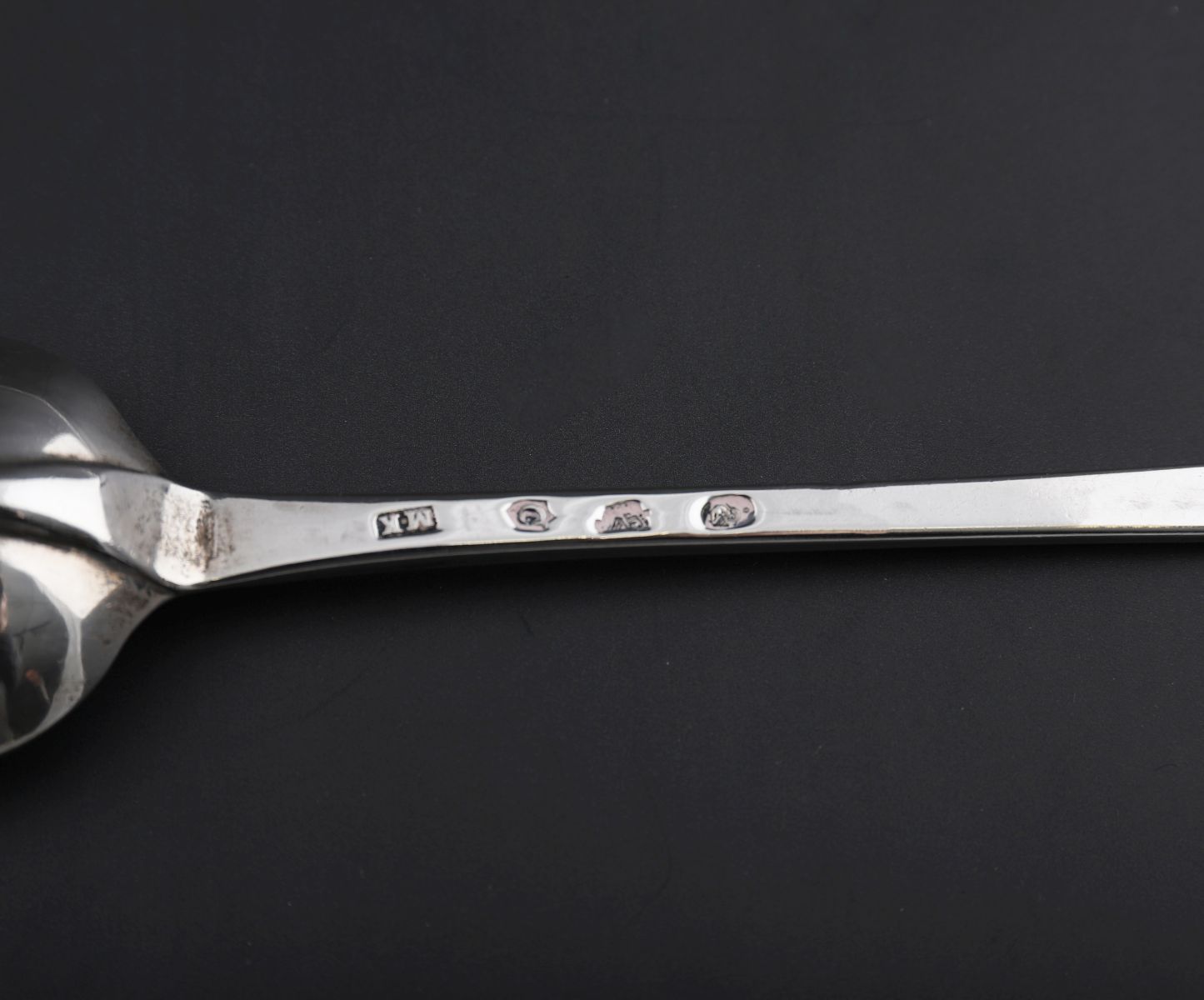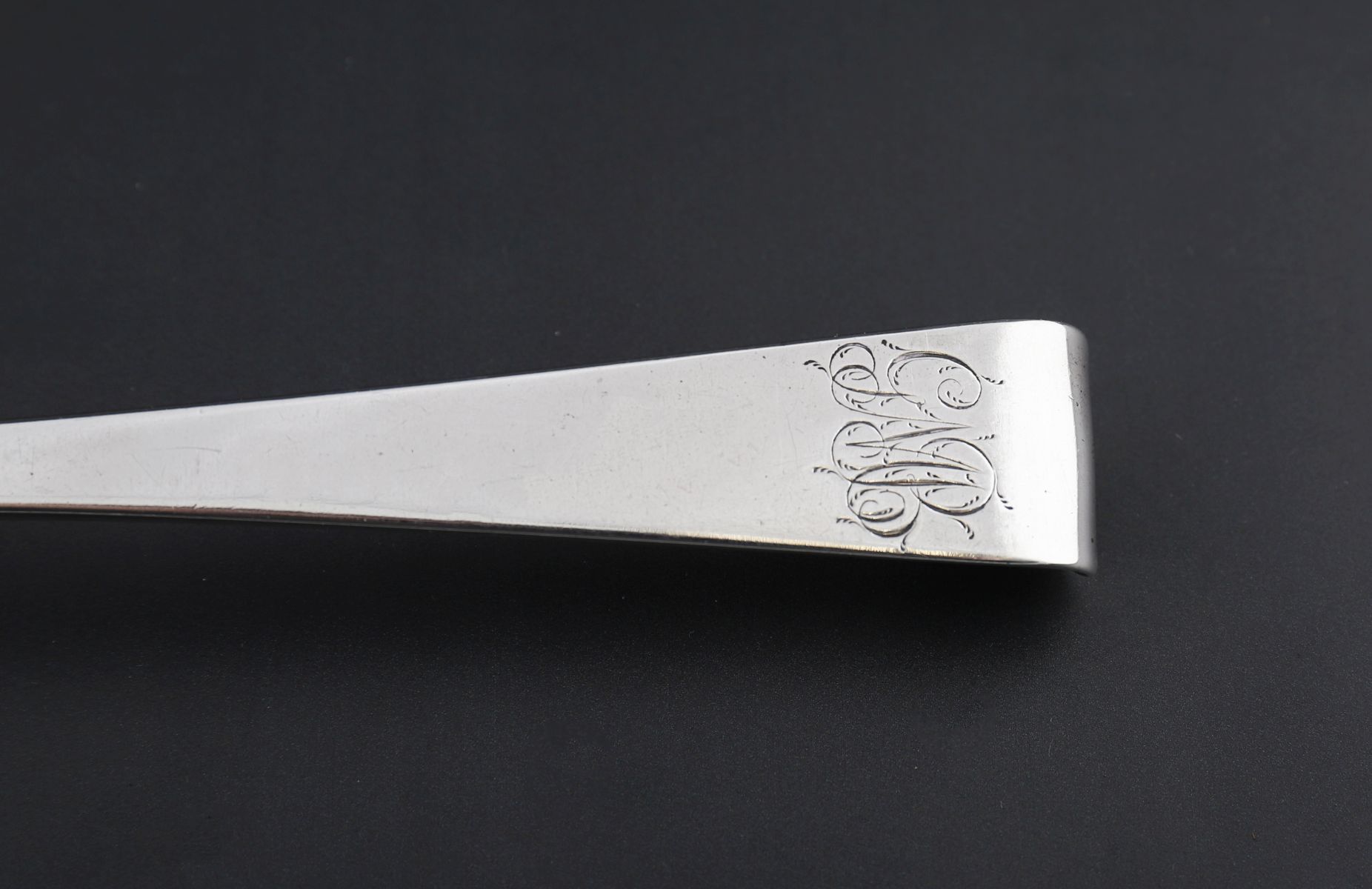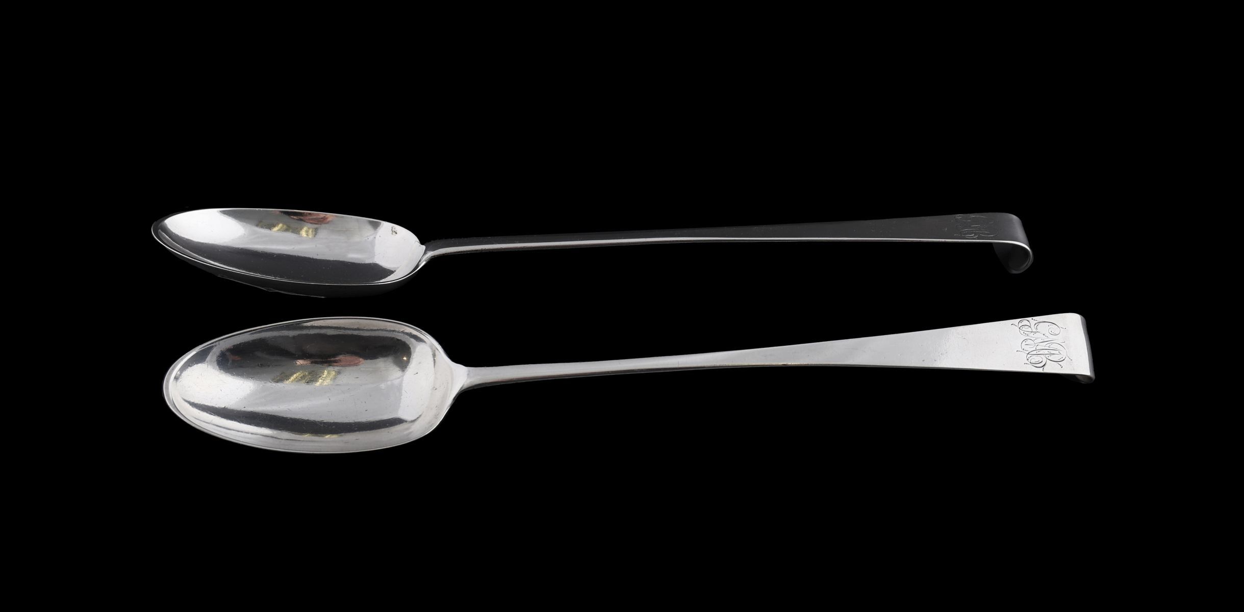 A pair of George III Irish silver hook-end basting spoons, mark of Michael Keating, Dublin, 1775. With rat-tail bowls and engraved initials “GMB.†combined weight 244 g (7.75 oz)