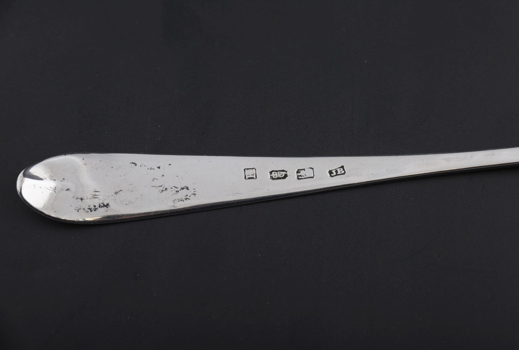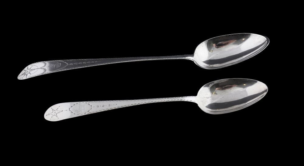 A George III Irish silver serving spoon, John Shields, Dublin, 1786, with bright-cut decoration; together with a George III Irish bright-cut tablespoon, John Boland, Dublin, 1804. combined weight 186.6 g