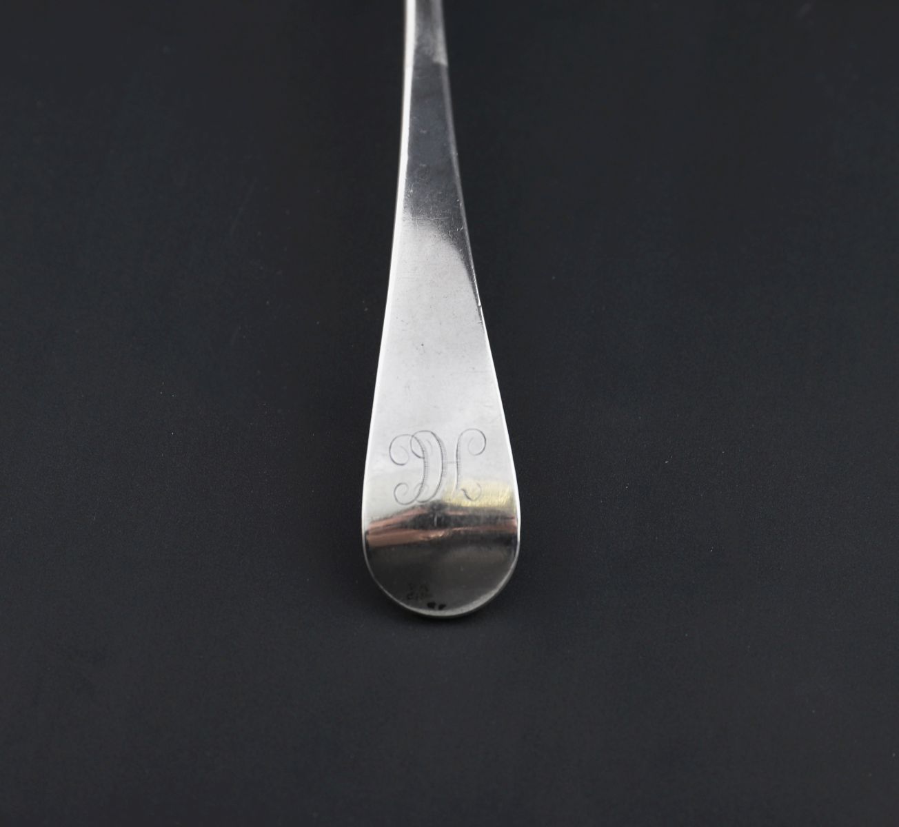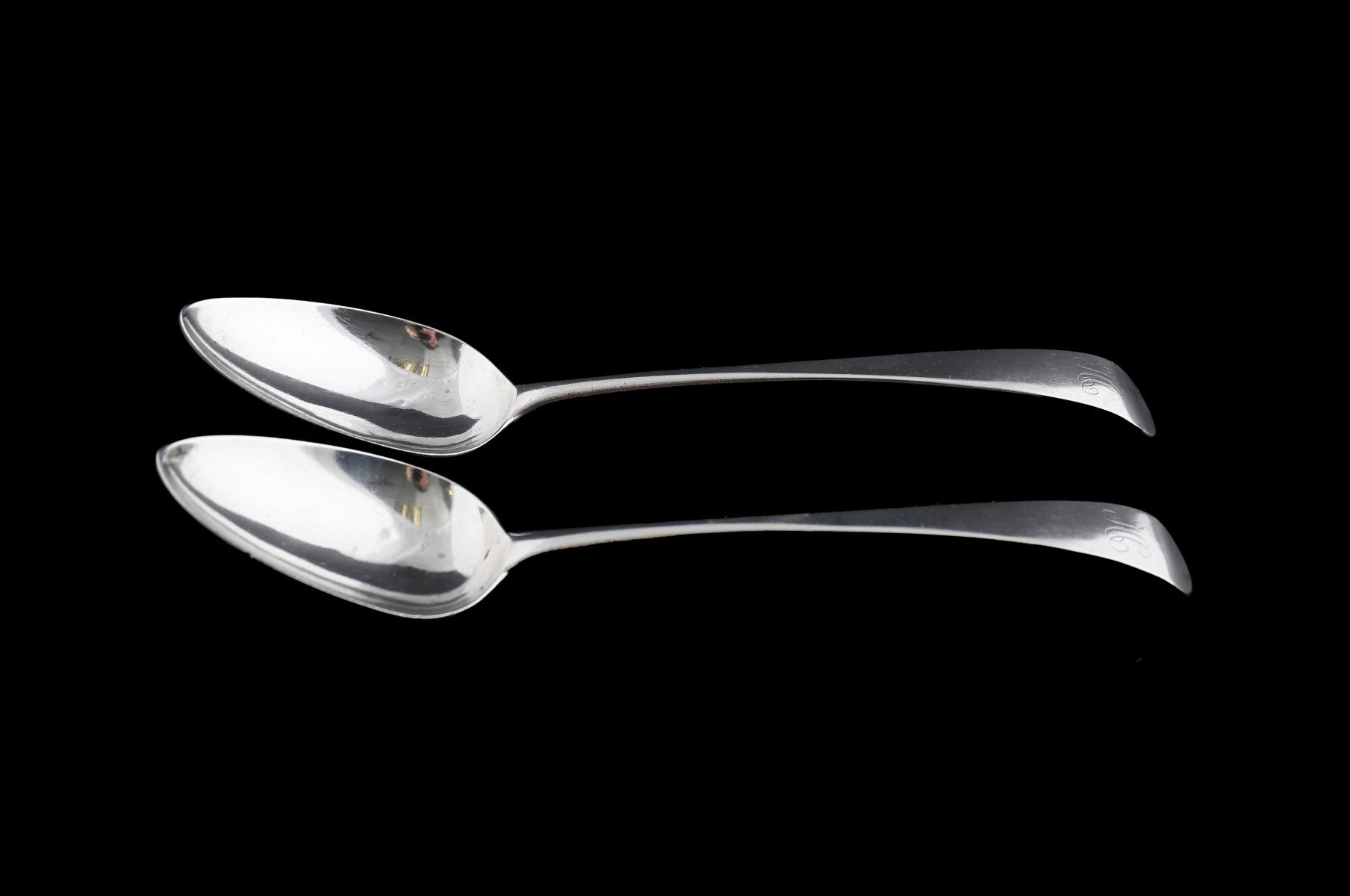 A pair of George III silver Old English pattern basting spoons, William Eley, London, 1801. Each with plain bowl and monogrammed terminals. combined weight 6.3 oz