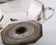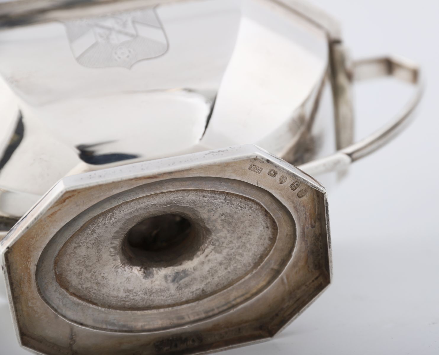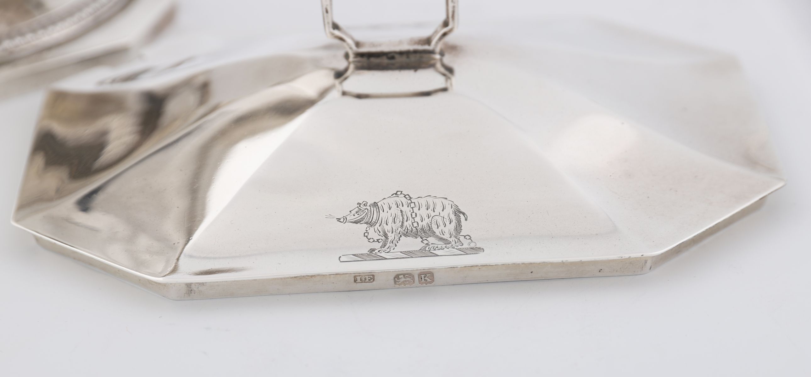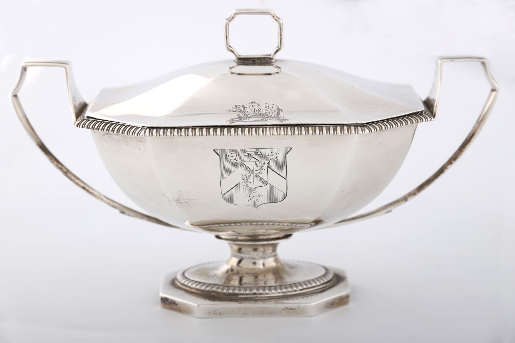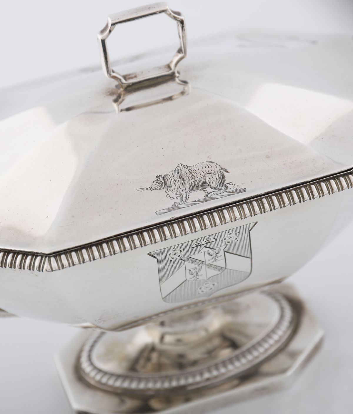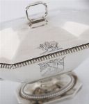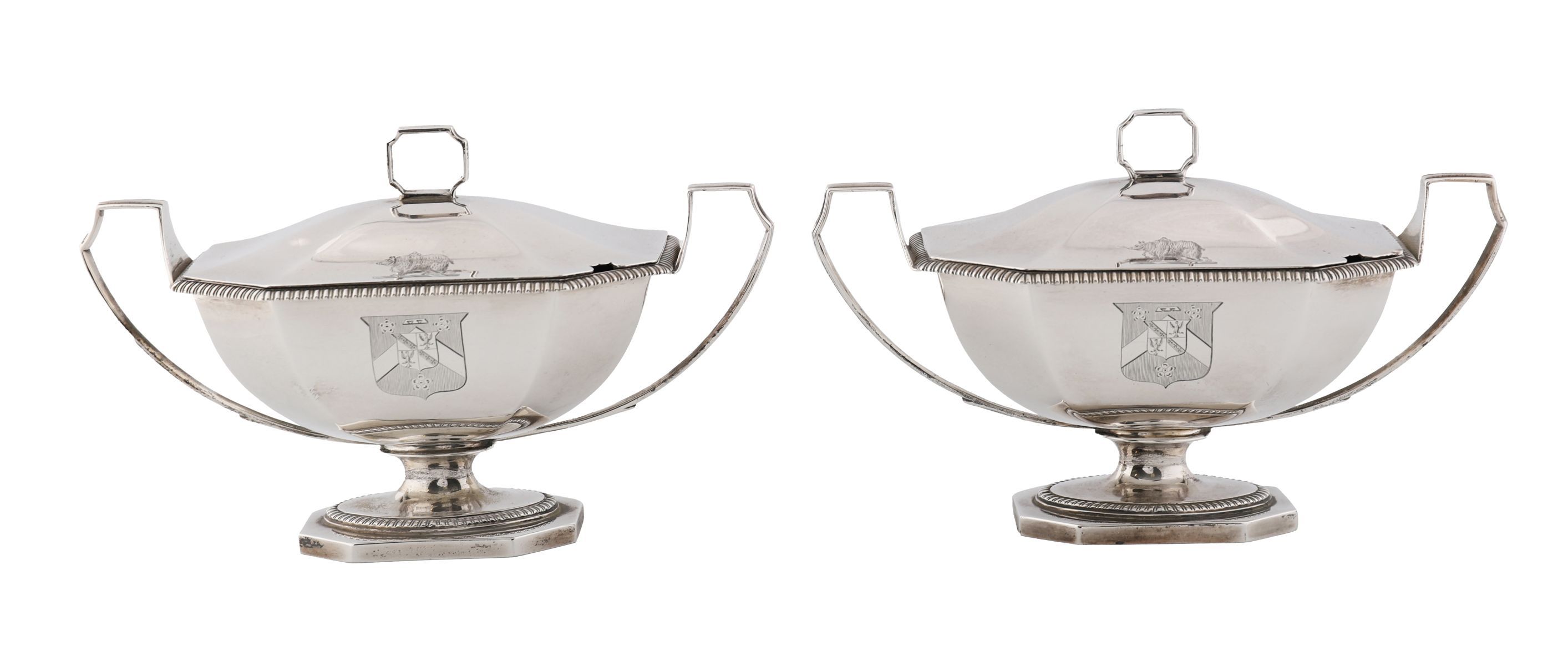 A pair of George III silver sauce-tureens and covers, mark of John Edwards, London, 1805. Each octagonal with gadrooned borders, angular reeded handles, and domed covers engraved with a crest and coat of arms, the arms of Chambers impaling Polhill for Robert Joseph Chambers (1779–1843) and wife Eliza. Each marked on foot and cover bezel. weight 45 oz (1,421 gr)