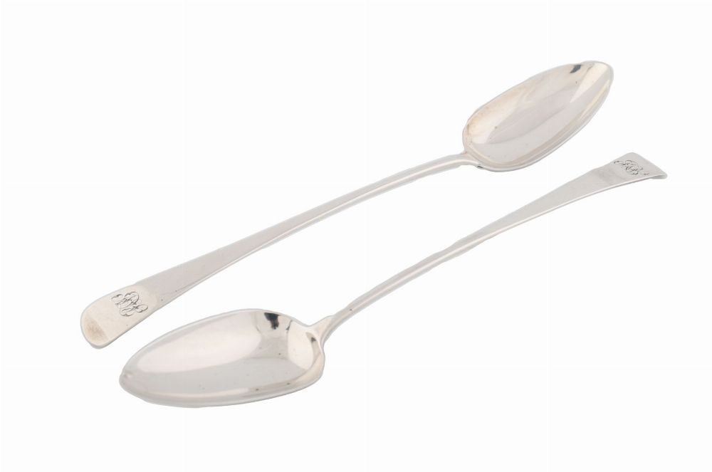 A pair of heavy-gauge silver serving spoons, hallmarked London 1801, makers’ mark WE, of Old English pattern with engraved crests. Weight: 199 g combined
