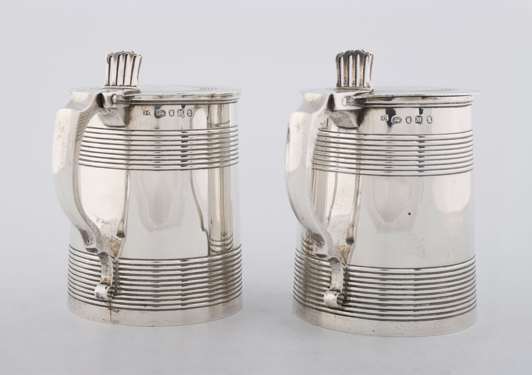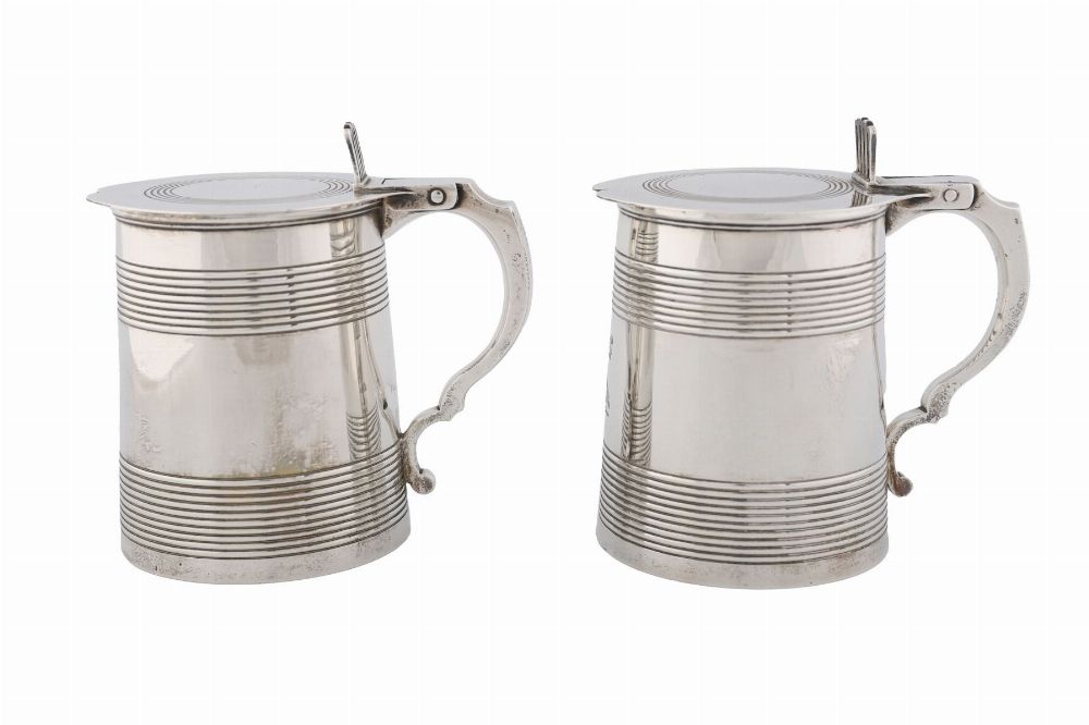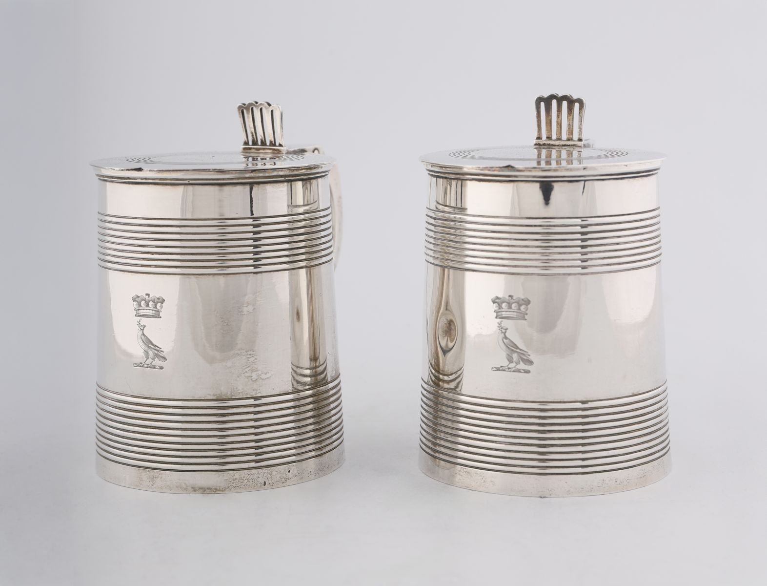 A pair of George III silver tankards, John Clarke, London, 1807. Each cylindrical with engraved crest between reeded bands, domed lids with flat finials, and pierced thumbpieces. Each hallmarked. combined weight 962 g (30 oz 18 dwt)