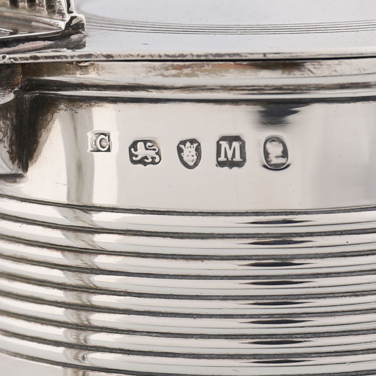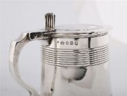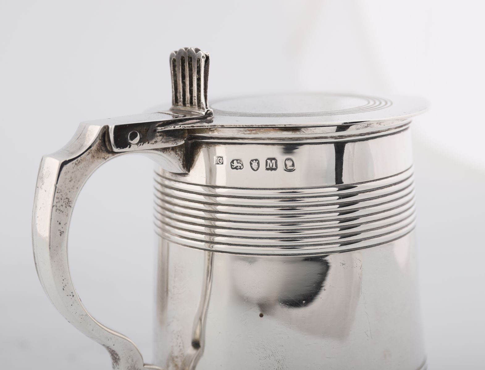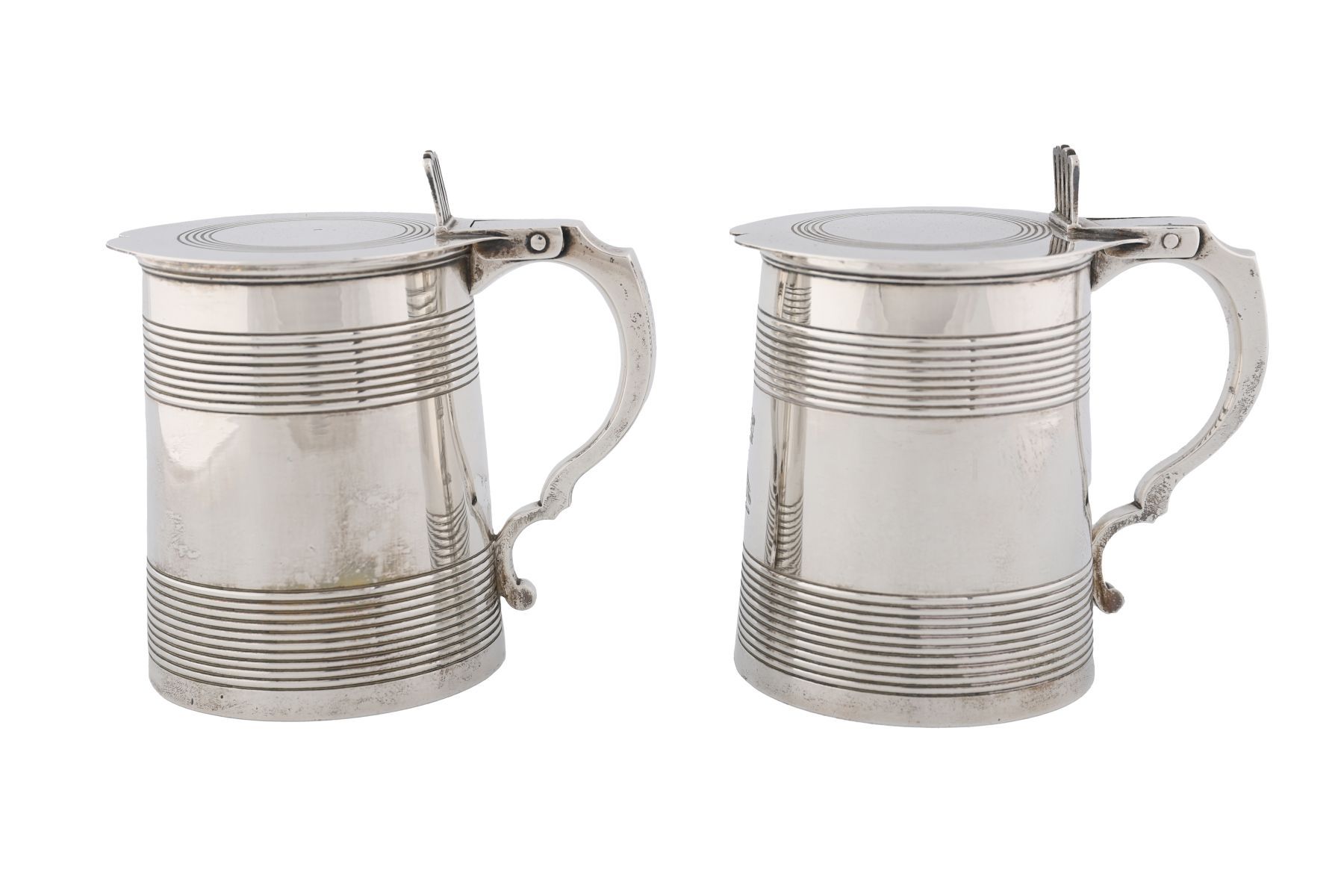 A pair of George III silver tankards, John Clarke, London, 1807. Each cylindrical with engraved crest between reeded bands, domed lids with flat finials, and pierced thumbpieces. Each hallmarked. combined weight 962 g (30 oz 18 dwt)