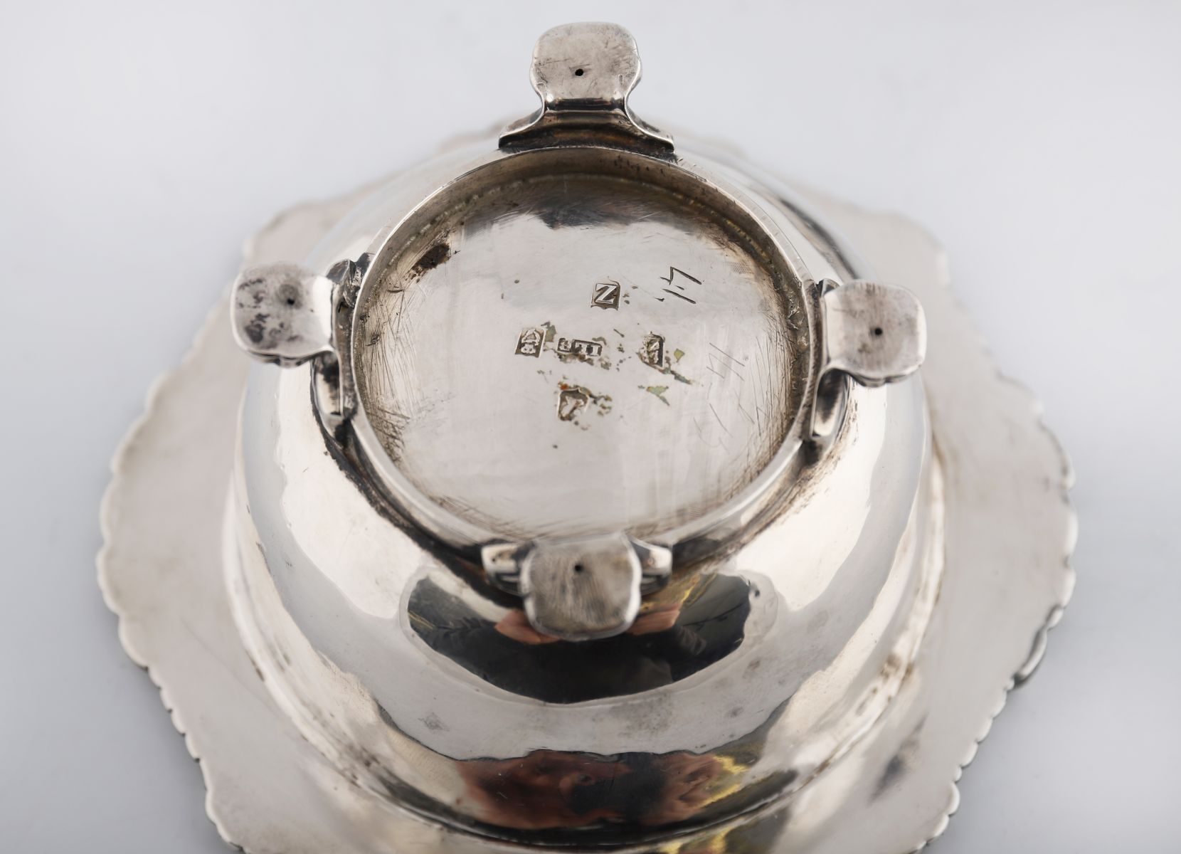A pair of George IV Irish silver circular salt cellars by James Le Bas, each with foliate and scroll-decorated rims, raised on three paw feet.