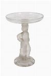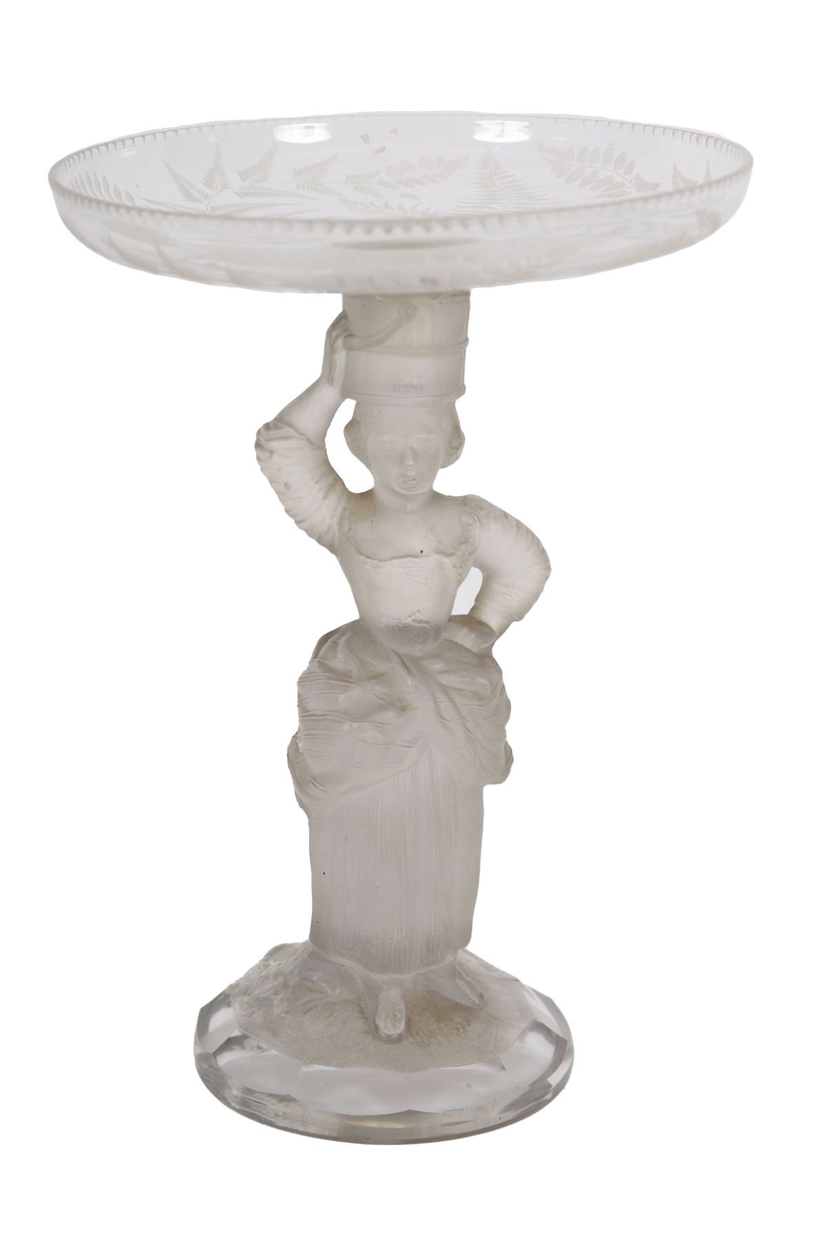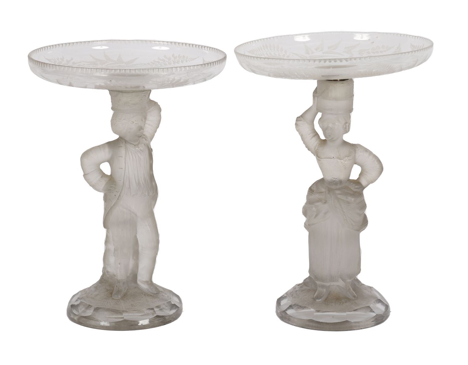 A pair of German frosted glass figural tazza, each supported by a standing female figure holding aloft a shallow dish, the glass moulded and finished in a satin frost. Late 19th / early 20th century.