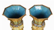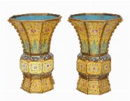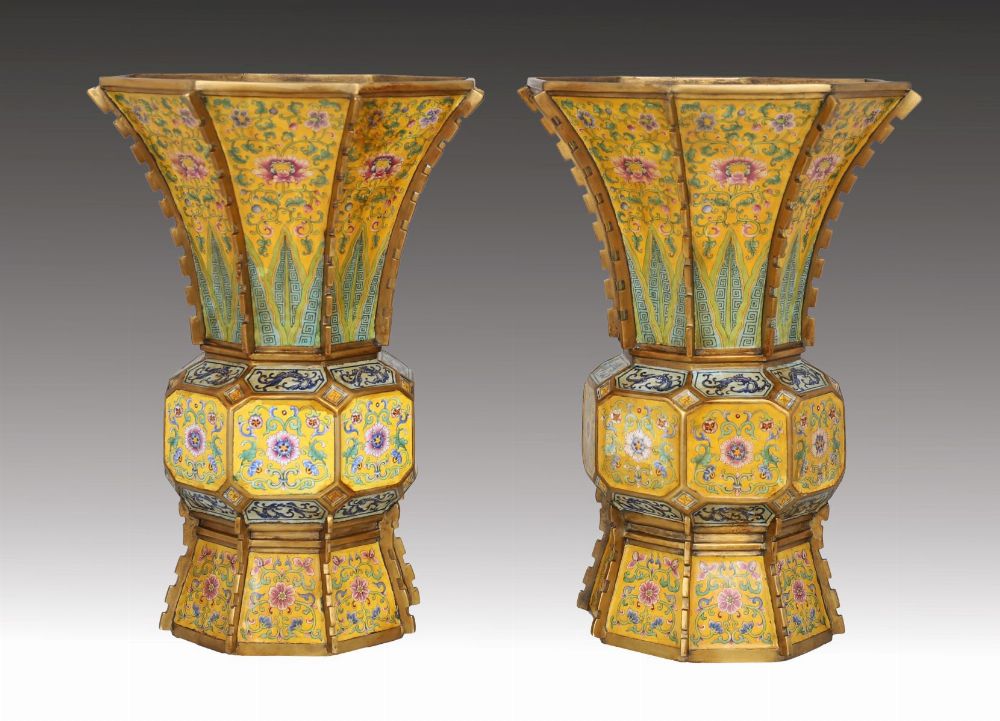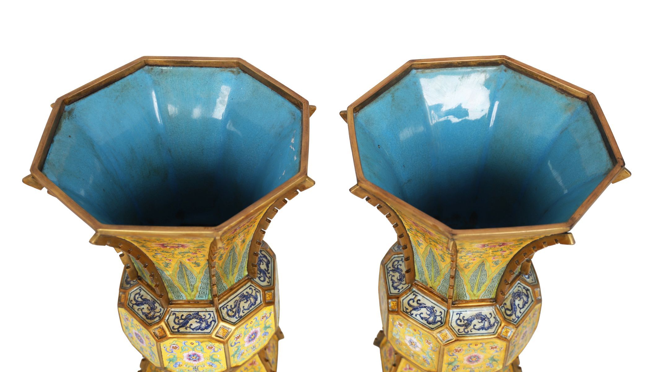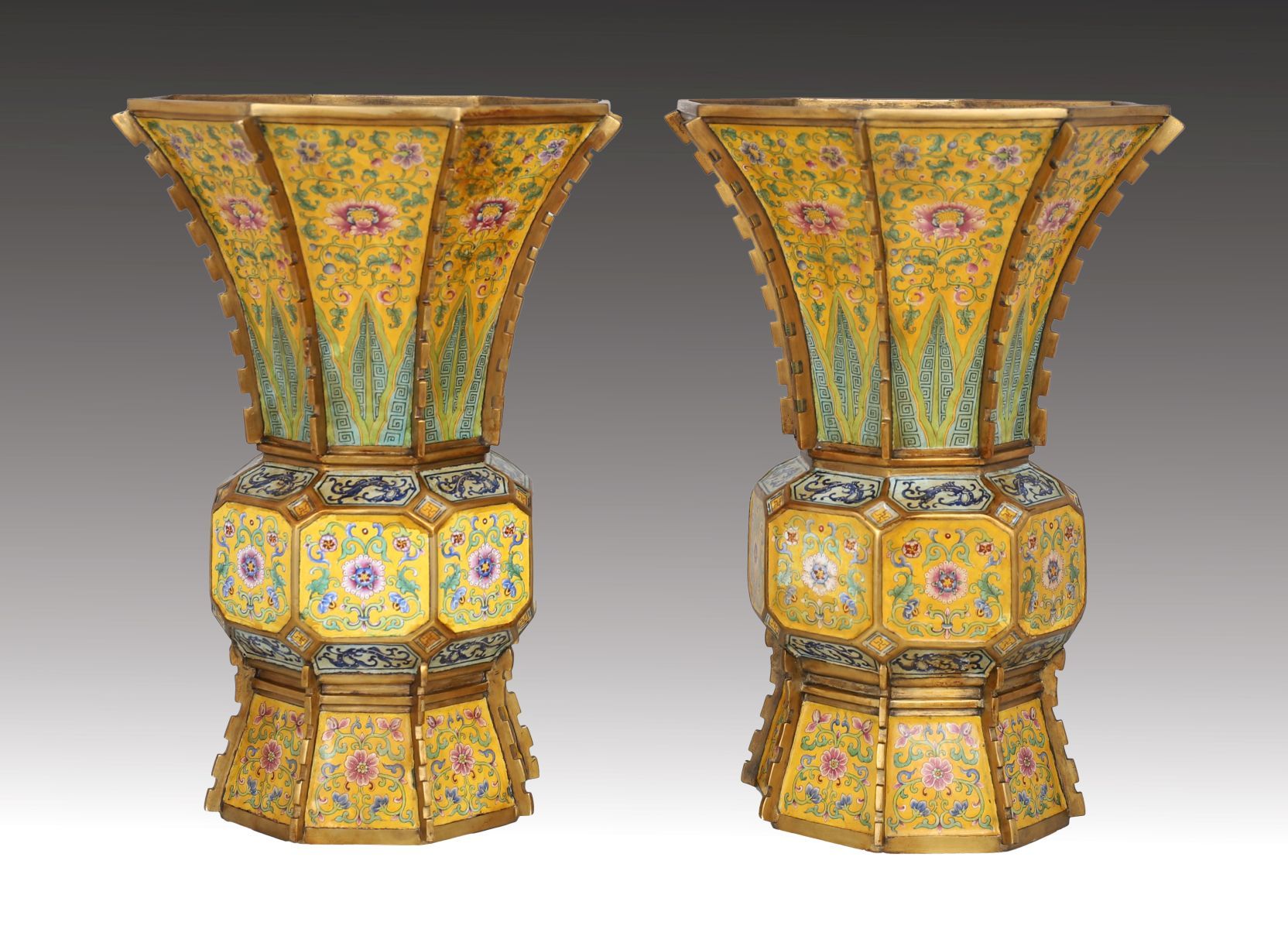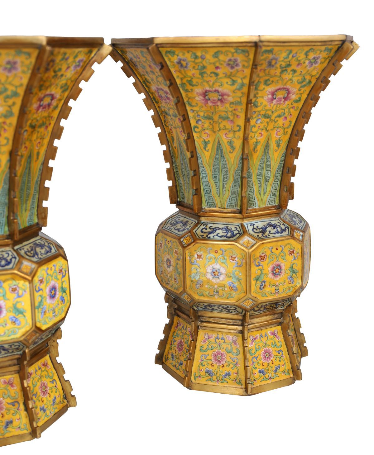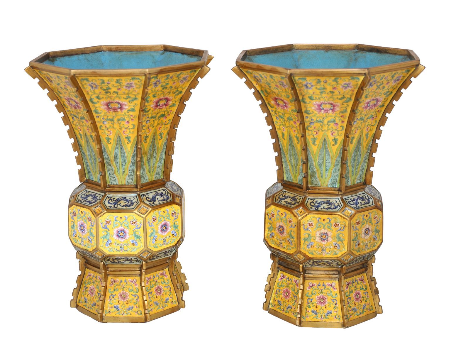 Lot 95 PAIR OF GILT BRONZE AND CLOISONNÉ GU-SHAPED VASES