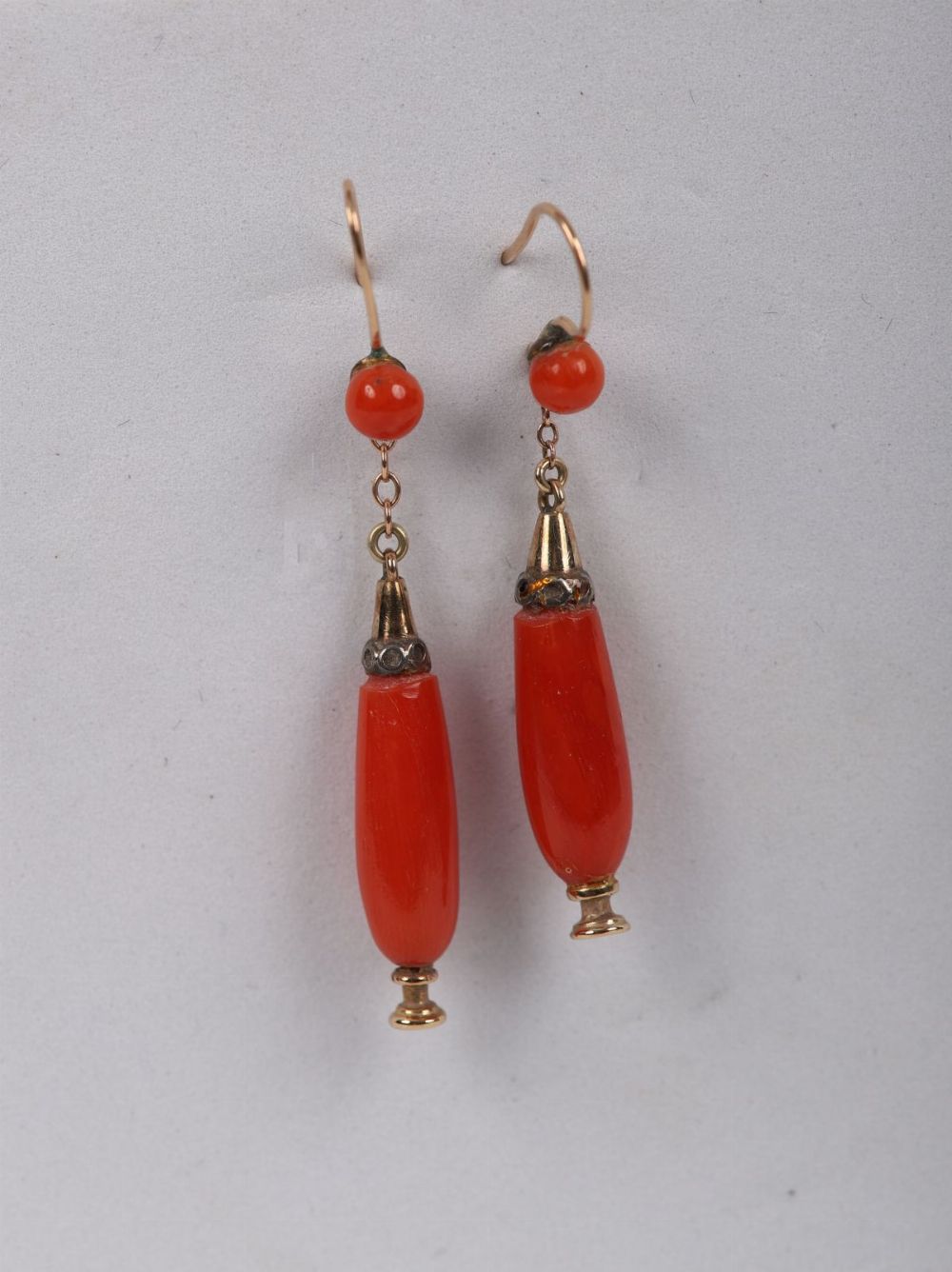Lot 562 PAIR OF GOLD AND CORAL DROP EARRINGS