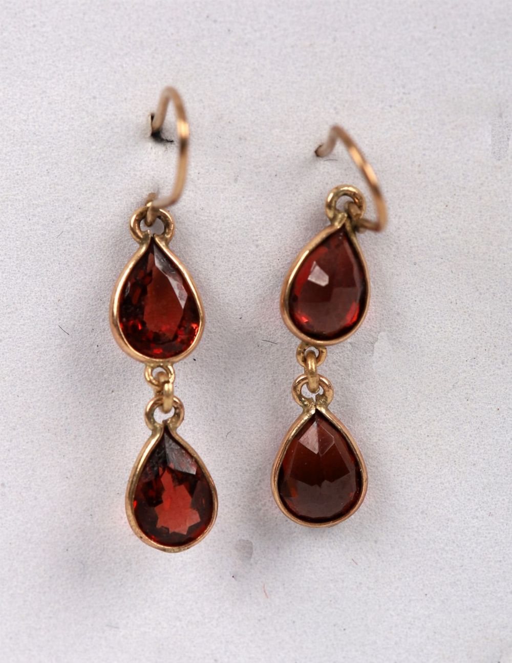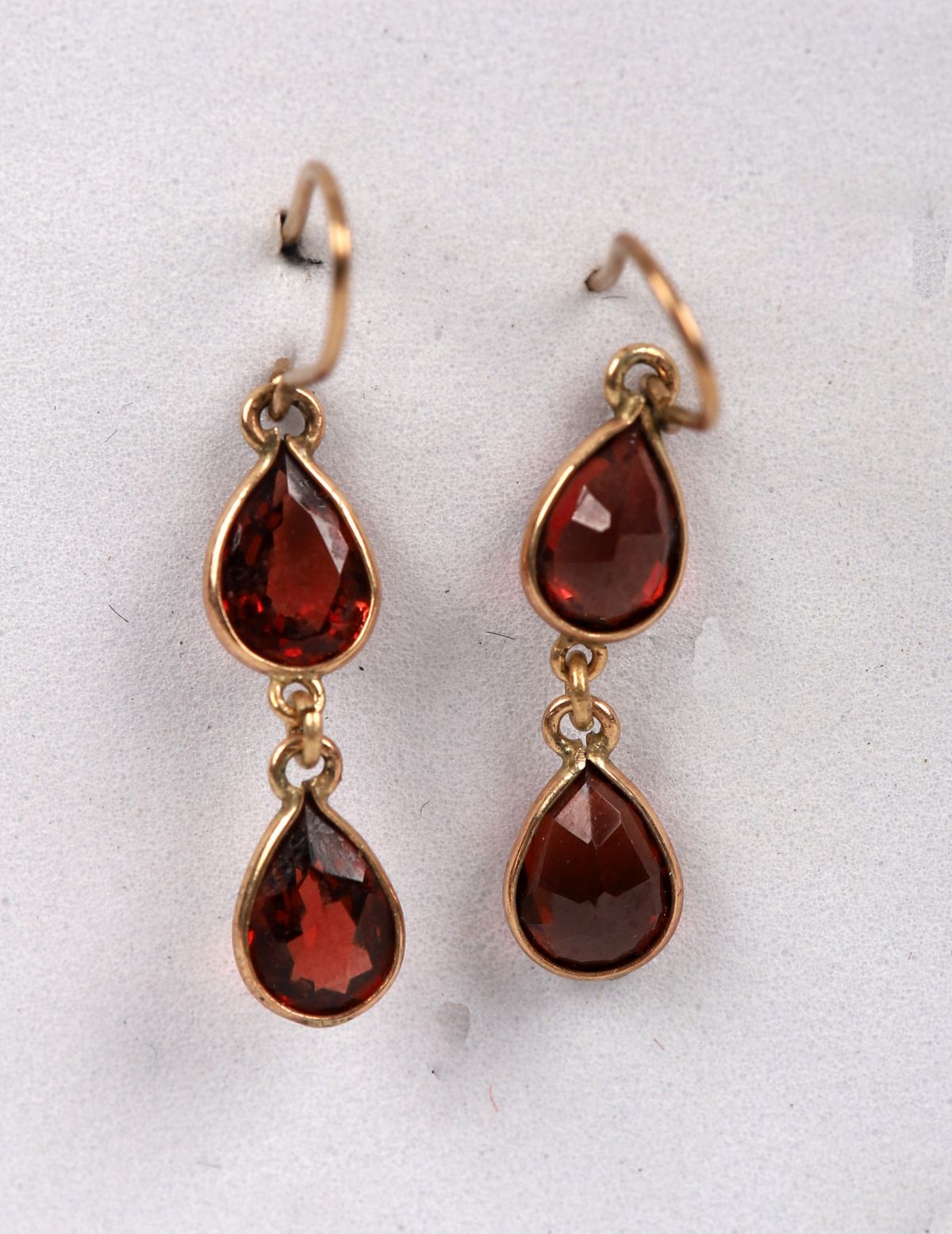 Lot 645 PAIR OF GOLD AND GARNET DROP EARRINGS