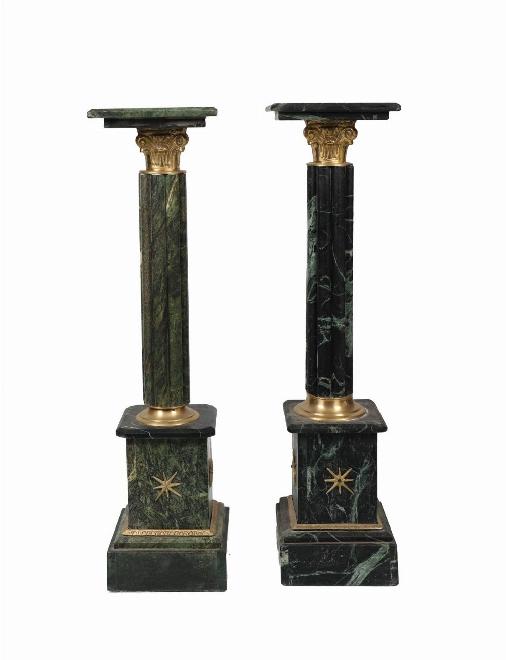 A striking pair of decorative pedestals, each of fluted green marble with gilt metal Corinthian capitals and bases, standing on stepped square plinths with starburst motifs.