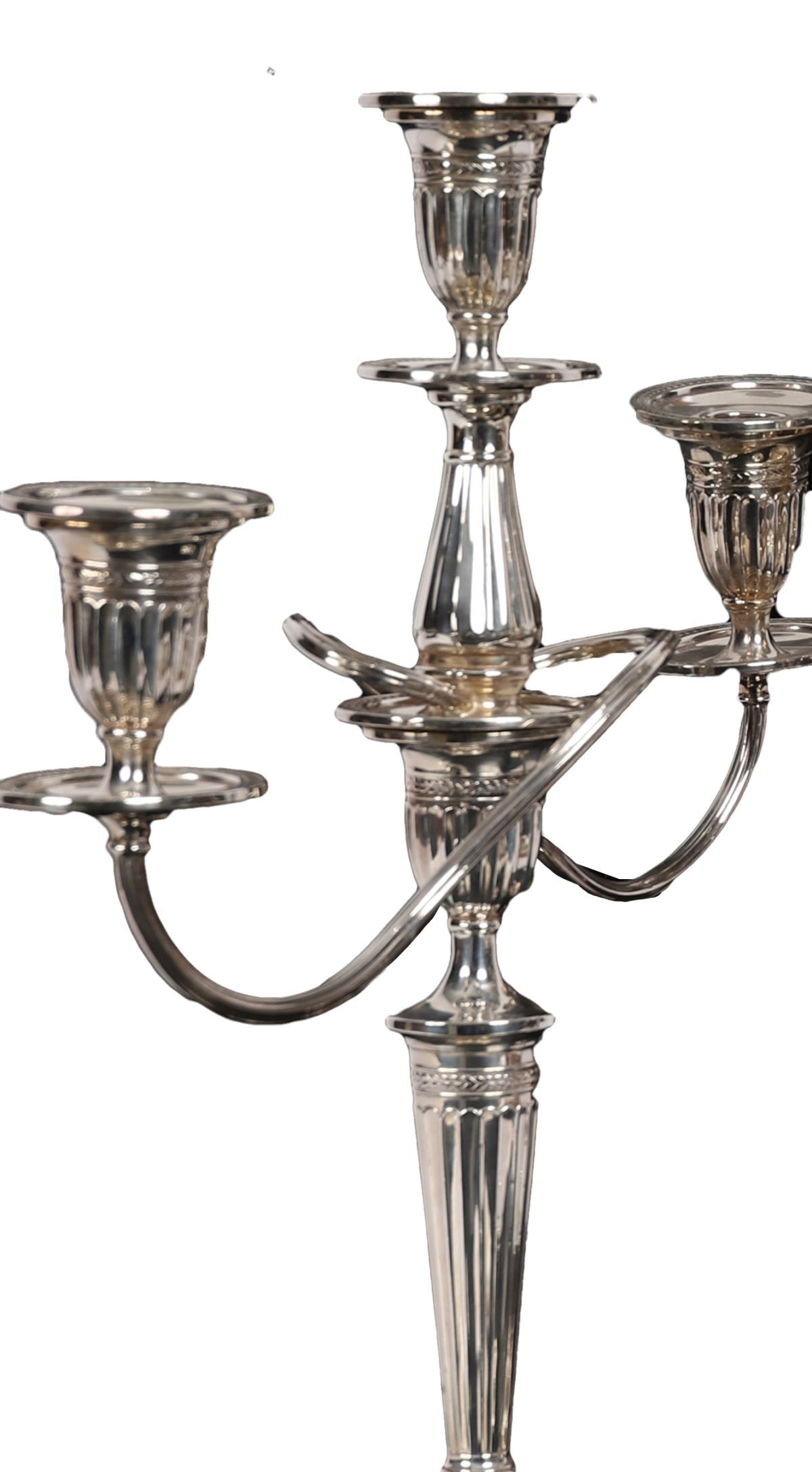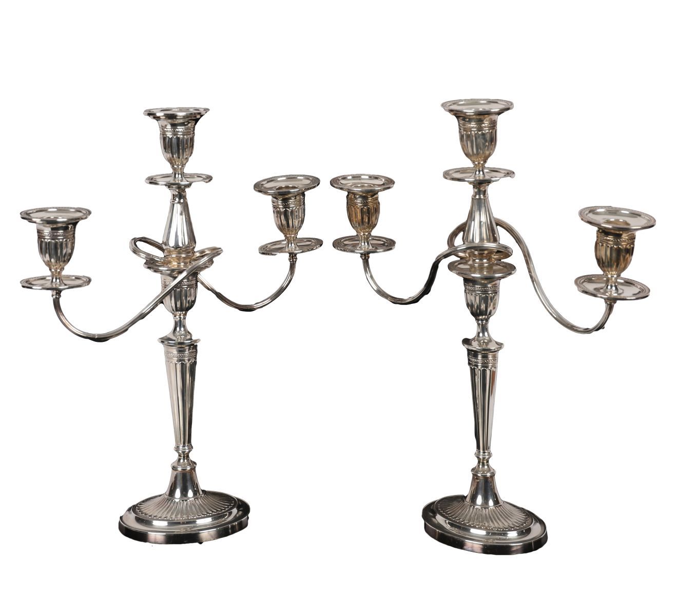 Substantial twin-tier candelabra, each with five sconces, gadrooned detail and fluted stems on circular bases, retaining original silver plating.