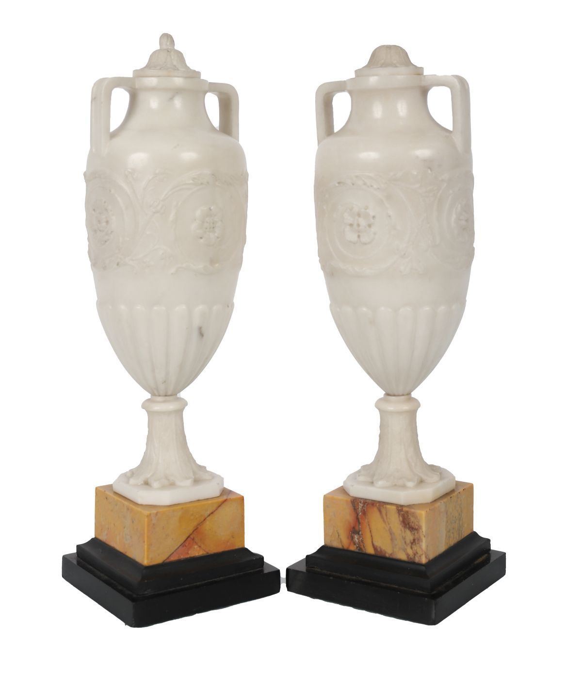 An important and finely carved pair of Roman marble urns, each of amphora form with twin handles and relief decoration of acanthus and floral motifs, the bodies displaying subtle tooling and weathered patination consistent with antiquity. Each is mounted on a later Grand Tour-era base of square Sienna marble with ebonised foot, enhancing their presentation while preserving their original integrity.
