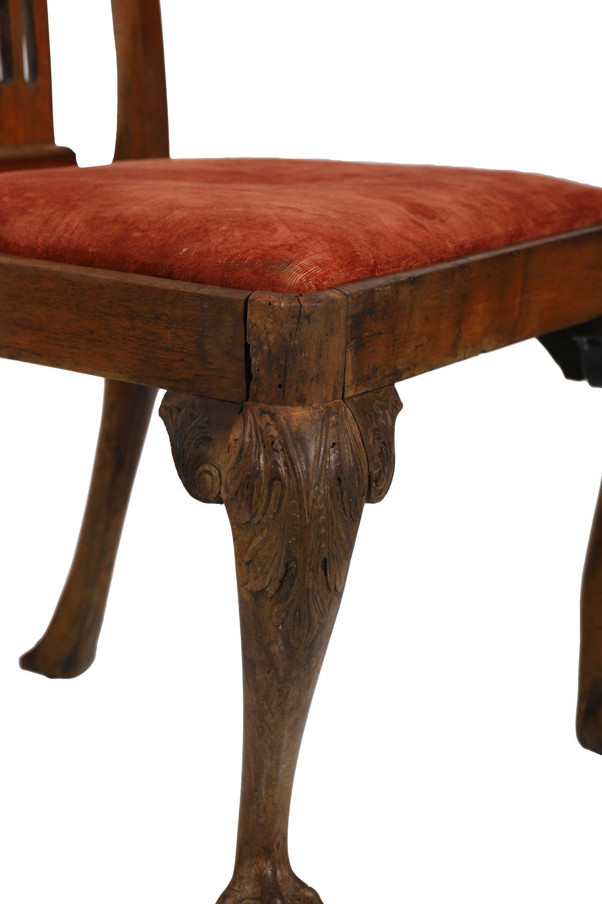 Each chair with a shaped and pierced splat back below a shell-carved crest rail, drop-in seat upholstered in rust-red velvet, on cabriole front legs carved with acanthus and terminating in claw-and-ball feet.