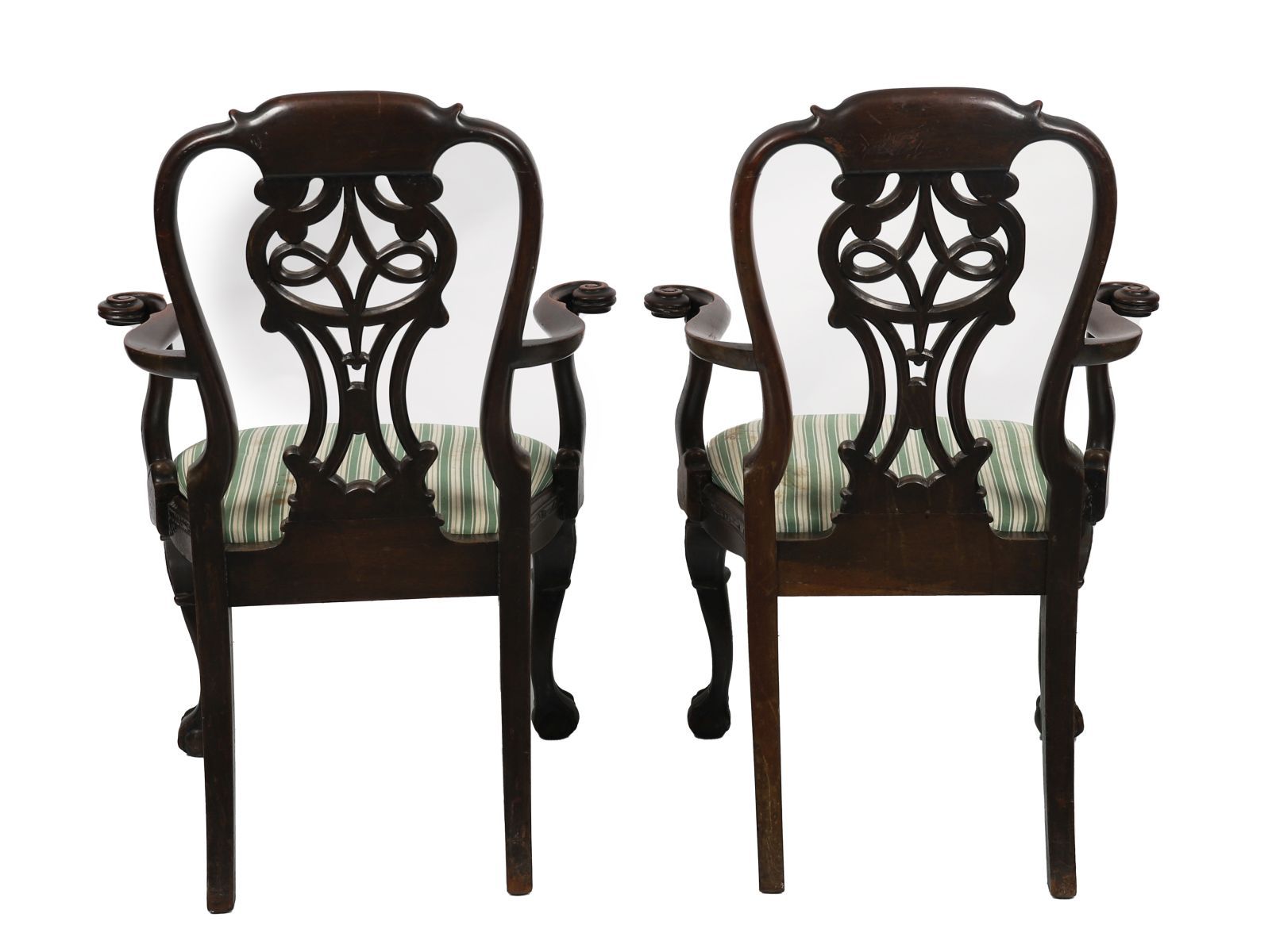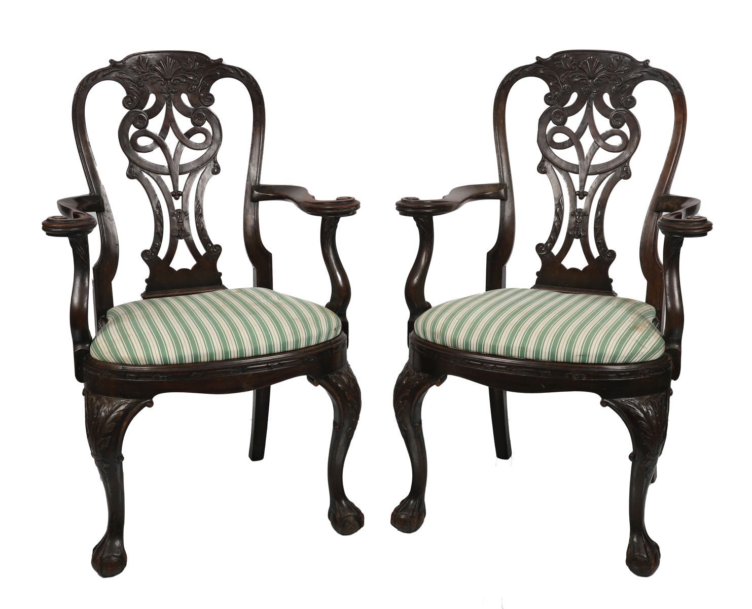 Each with pierced and carved splat back incorporating C-scrolls and foliate detail, the shaped arms on cabriole supports above upholstered drop-in seats, raised on carved cabriole legs terminating in claw-and-ball feet.