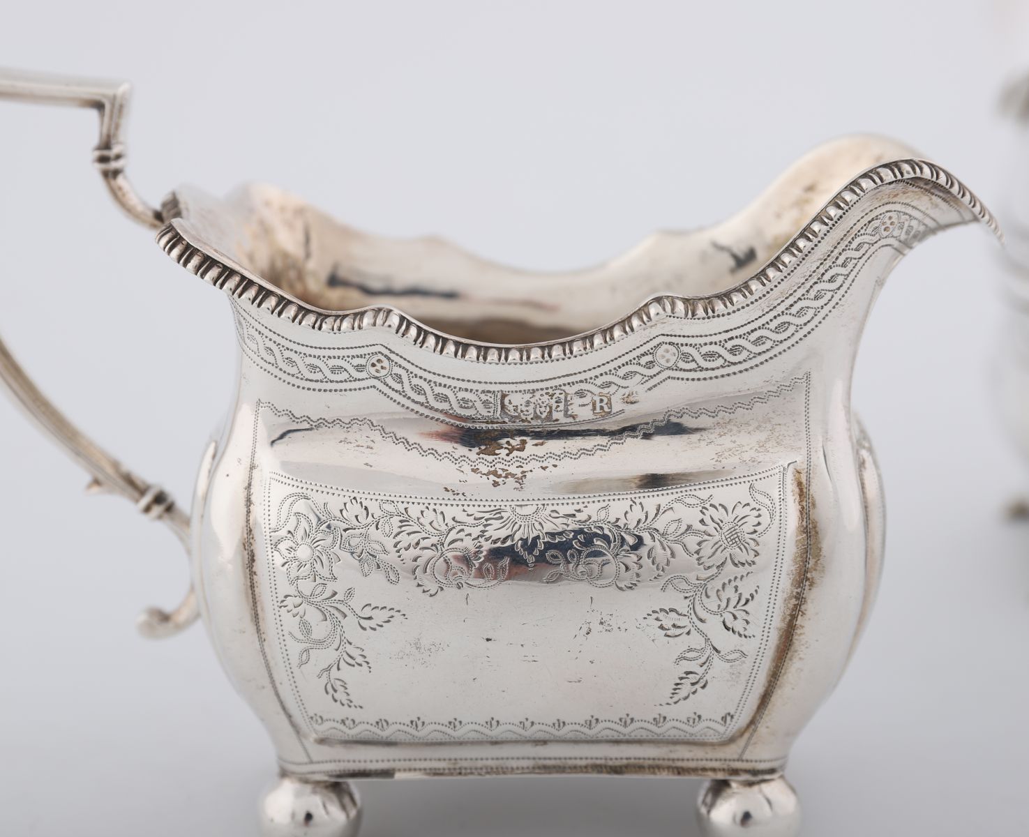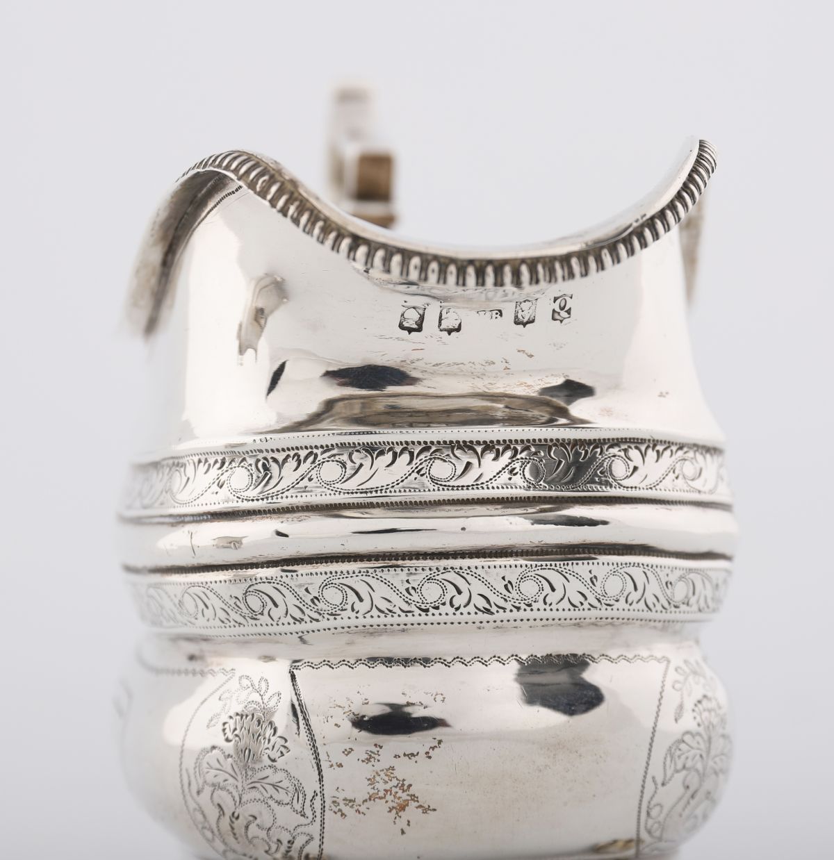 A pair of Irish George III silver cream jugs, Dublin, 1812, marks possibly those of James Le Bas. Each of ovoid form with gadrooned rim, lobed panels decorated with bright-cut engraving, stylised ‘S’ scroll handle, and claw or ball feet. combined weight approx. 350 g (12 oz)