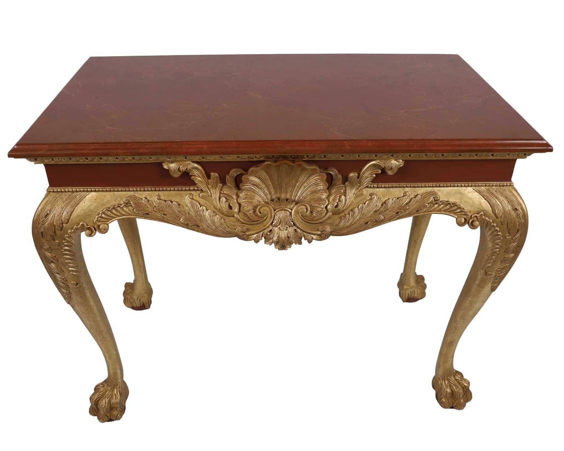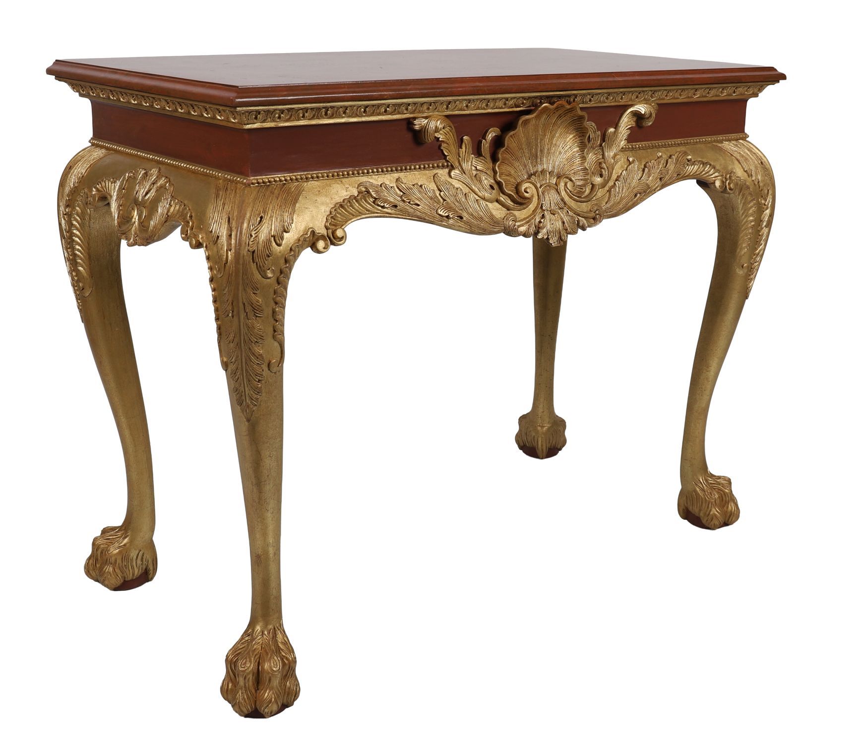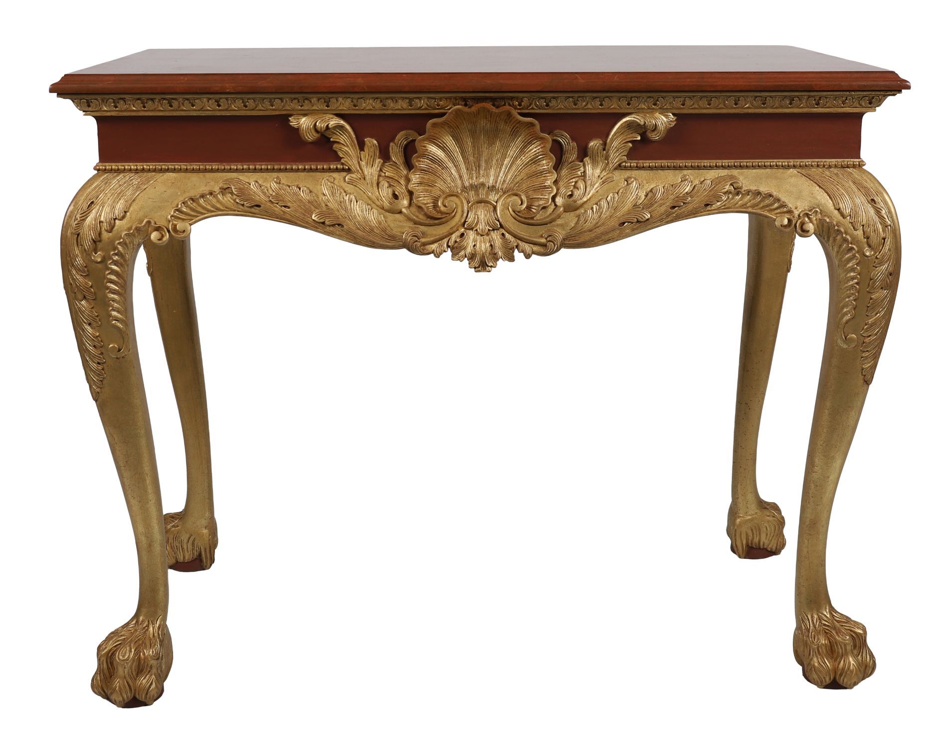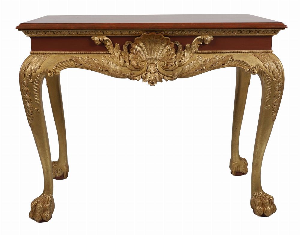 A pair of finely carved Irish mahogany console tables, each with shaped frieze centred by a gilt scallop shell and foliate scrollwork, raised on cabriole legs terminating in paw feet, with gilt highlights.